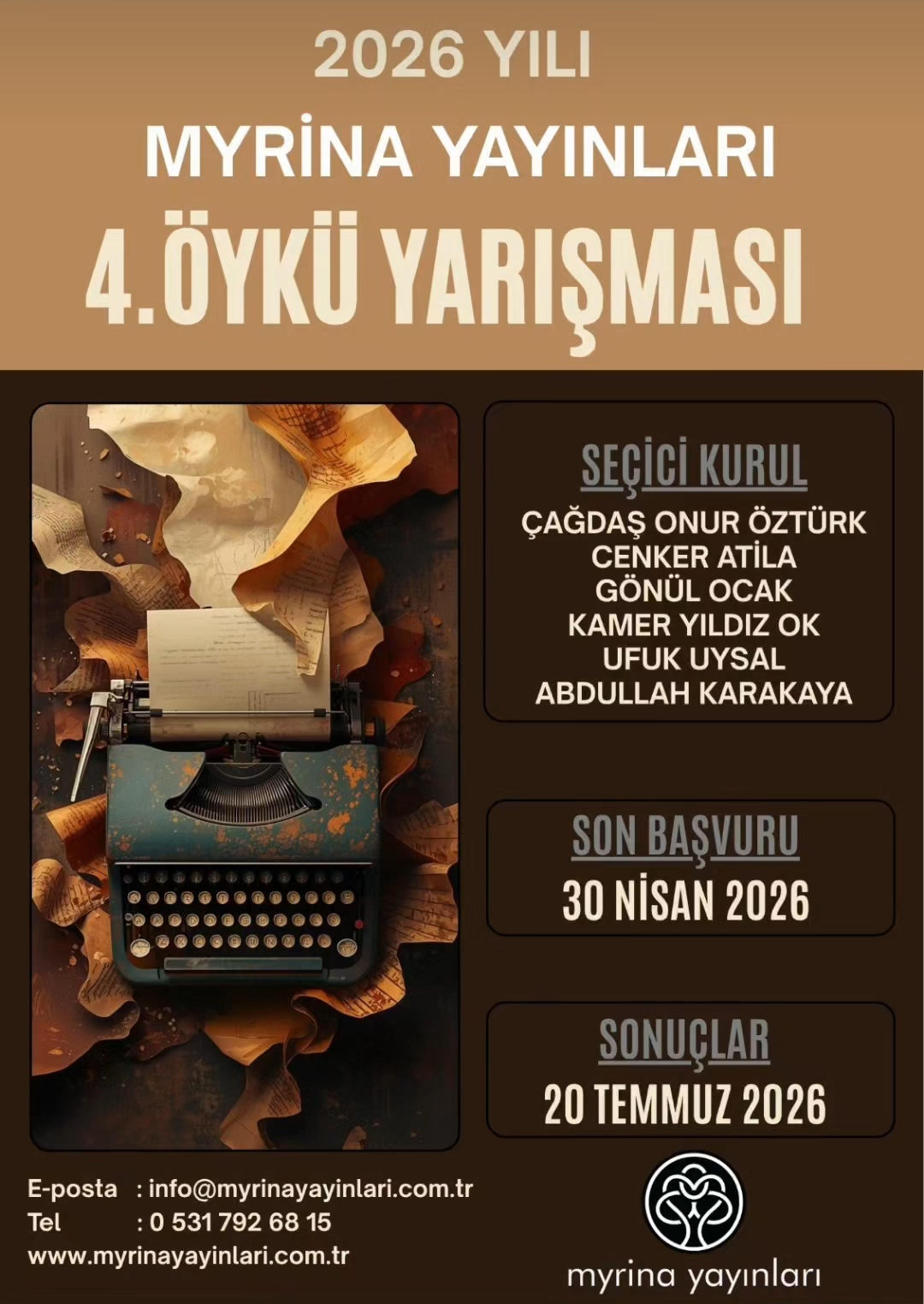 Myrina Yayınları 2026 Yılı Öykü Yarışması başvuruları açıldı. Yarışmaya son başvuru tarihi 30 Nisan 2026.