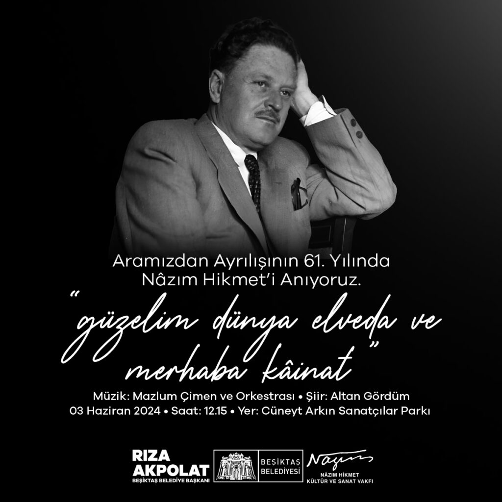 Nâzım Hikmet Kültür ve Sanat Vakfı, Beşiktaş Belediyesi ortaklığında 3 Haziran saat 12.00’de Beşiktaş Sanatçılar Parkı Mehmet Aksoy’un Nâzım Hikmet heykeli önünde anma gerçekleştirilecek. Anmada Mazlum Çimen şairden besteler seslendirecek, Vakıf Yönetim Kurulu üyesi, sanatçı Altan Gördüm Nâzım Hikmet şiirleri okuyacak.