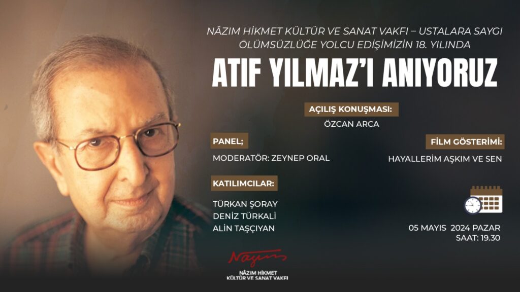 Nâzım Hikmet Kültür ve Sanat Vakfı 5 Mayıs saat 19.30’da “USTALARA SAYGI etkinlikleri çerçevesinde; “Ölümsüzlüğe Yolcu Edişimizin 18. Yılında ATIF YILMAZ’I Anıyoruz.” başlıklı etkinlik gerçekleştirecek.