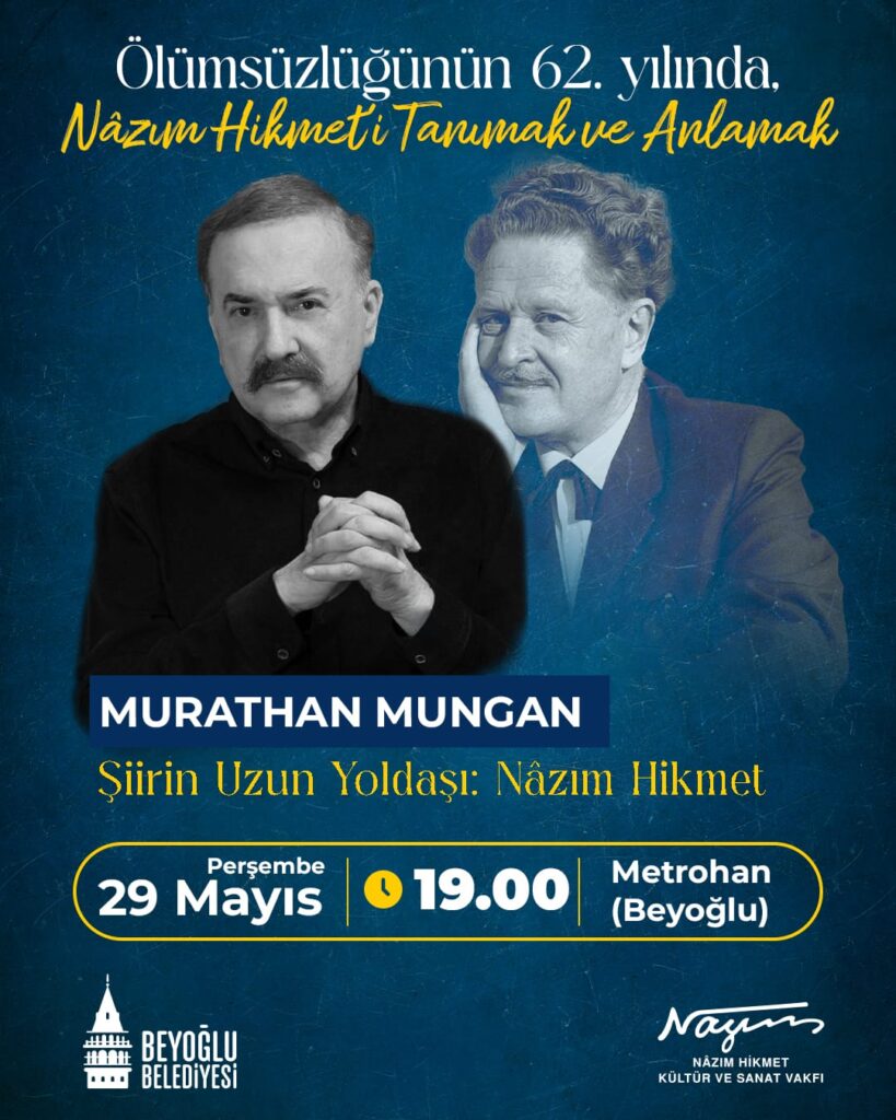 Nâzım Hikmet Kültür ve Sanat Vakfı tarafından düzenlenen süreli etkinliklerden biri olan “Nâzım Hikmet’i Tanımak ve Anlamak” dizi konuşmalarının bu ayki konuğu Murathan Mungan olacak.