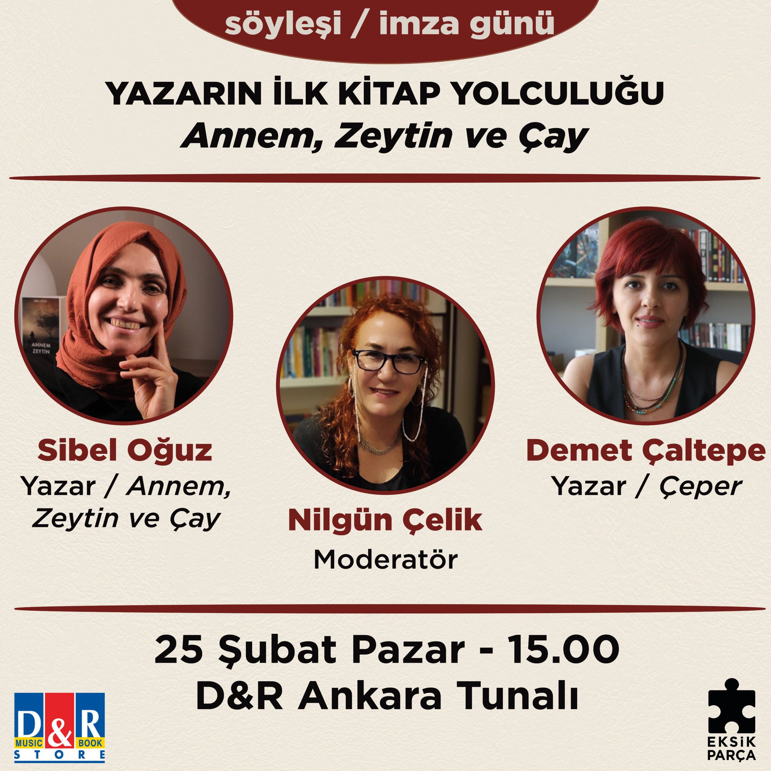 Değerli edebiyatçı Nilgün Çelik’in modere ettiği etkinlikte, Sibel Oğuz’un Eksik Parça Yayınları’ndan yayımlanan Annem, Zeytin ve Çay adlı kitabı üzerine söyleşilecek. Demet Çaltepe’nin de katılacağı etkinlik, 25 Şubat’ta Ankara, Tunalı DR’da saat 15.00’de gerçekleşecek.