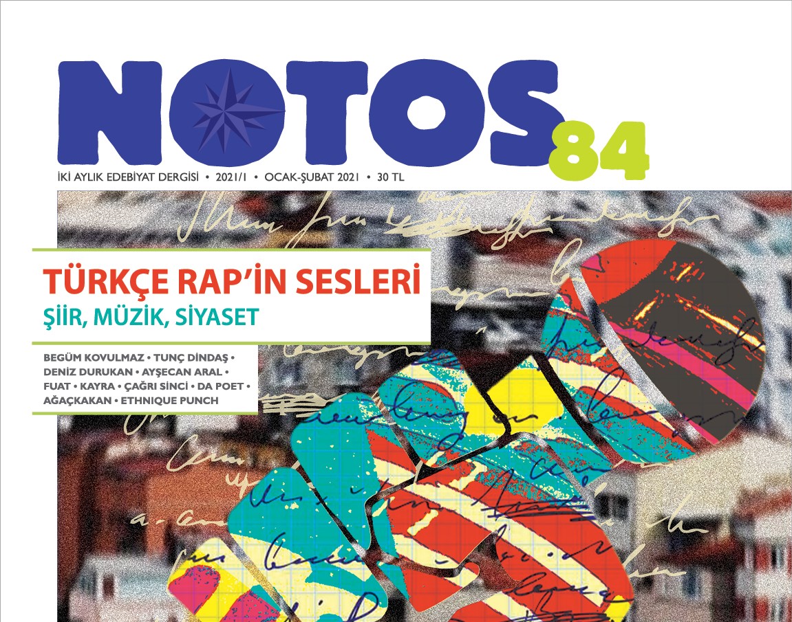 Notos Ocak-Şubat, 84. sayısında Türkçe Rap’e yöneliyor. Sözlü kültür, müzik, edebiyat arasındaki etkileşimin son yirmi yıldaki en önemli verimi, Almanya ve ABD’deki hip hop ve rap kültürüyle köklenip gelişen ve kendine has bir müzik kültürü oluşturan Türkçe Rap oldu. Türkçe Rap’i şiirle bağları, müzikal özellikleri, söylem biçimleri, tarihi ve siyaseti üzerinden ele alan bu dosyada Begüm Kovulmaz, Tunç “Turbo” Dindaş, Deniz Durukan ve Ayşecan Aral’ın yazıları, Selin Çınar, Onur Aşkın, Turbo ve Seda Mit’in illüstrasyonları yer alıyor. Fuat, Çağrı Sinci, Kayra, Ağaçkakan, Da Poet ve Ethnique Punch “Şiirden Liriğe, Ozandan MC’ye: Türkçe Rap’in Sesleri” soruşturmasına yanıtlarıyla katkıda bulunuyor.