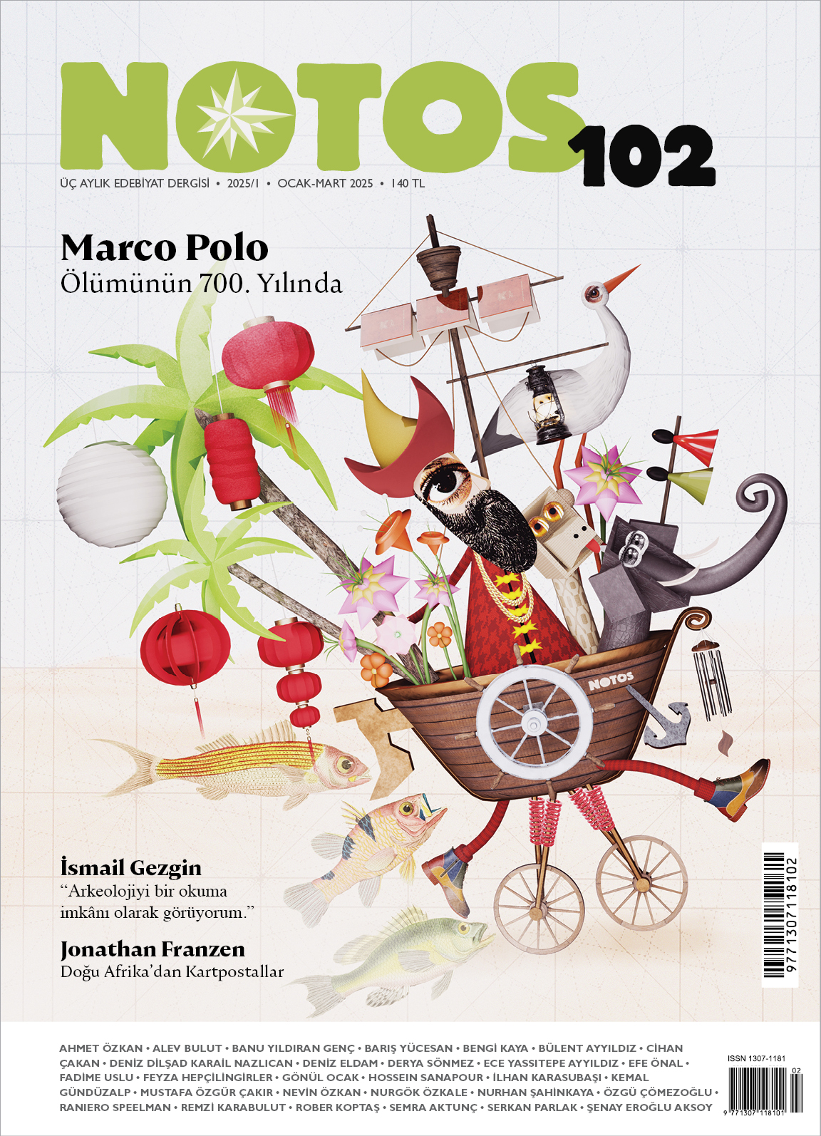Notos yaptığı bütün yazar dosyalarını kalıcı bir kaynağa dönüştüren anlayışıyla Ocak-Mart, 102. sayısında Marco Polo’ya yöneliyor. Onu yalnızca bir gezgin ya da kâşif olarak hatırlamak doğru olmaz. Çin’e yaptığı yolculuğun gizlerini tam olarak bilmemiz olanaksız. Anlattıklarından başka kim bilir neler yaşamış, nelere tanık olmuştur. Anıları 700 yıl sonra bugün hâlâ bir hazine.