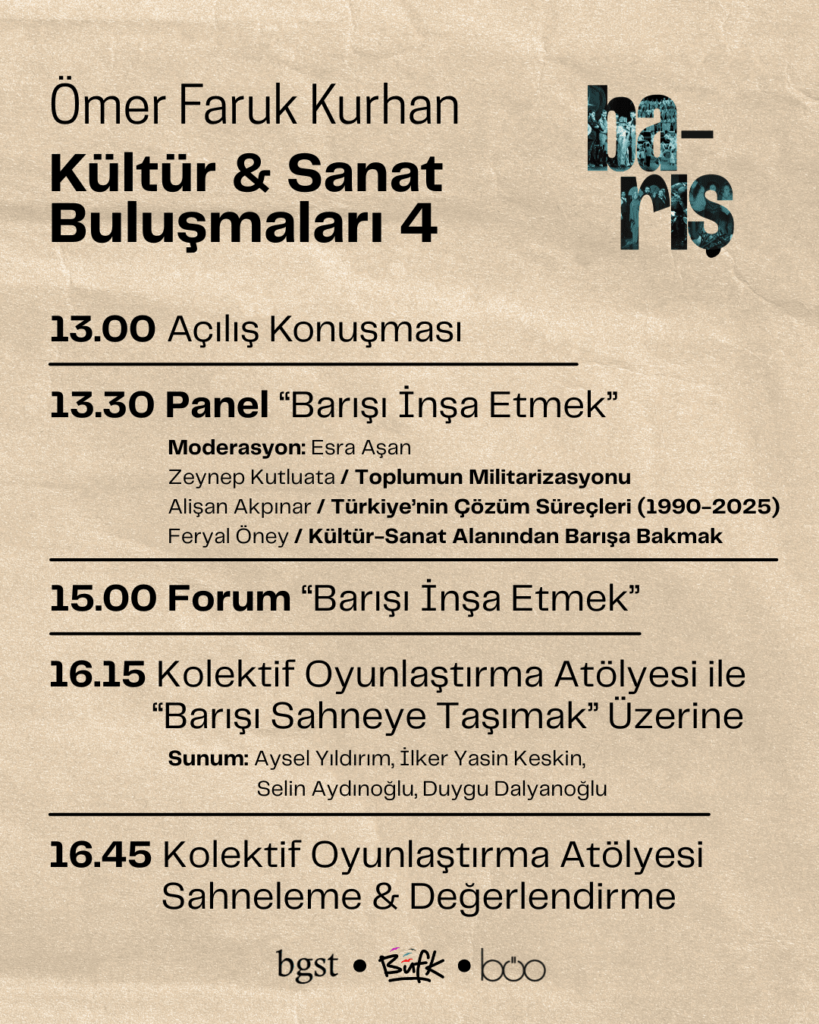 2021 yılında kaybettiğimiz tiyatrocu, oyuncu, yayıncı ve yazar Ömer Faruk Kurhan’ın anısına dördüncü kez düzenlenecek Kültür ve Sanat Buluşmaları, bu yıl “Barışı İnşa Etmek” temasıyla gerçekleşiyor. 14 Aralık 2025 tarihinde Boğaziçi Üniversitesi Demir Demirgil Salonu’nda düzenlenecek etkinlikte, Türkiye’de yeniden gündemde olan barış sürecinin toplumsallaşmasına yönelik panel ve forumun yanı sıra, Ömer Faruk Kurhan’ın tiyatro hayatı boyunca geliştirmeye çalıştığı “Kolektif Oyunlaştırma” deneyimi bağlamında “Barış’ı Sahneye Taşımak” teması ele alınacak ve sahneye taşınacaktır.