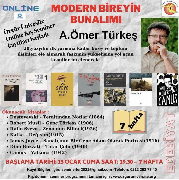 Ömer Türkeş ile 7 hafta sürecek “Modern Bireyin Bunalımı” seminerleri Özgür Üniversite Online Kış dönemi kapsamında başlıyor. Programın tamamı ve seminerlere katılabilmek için için ozguruniversite.org veya [email protected] adresine mail gönderebilirsiniz.