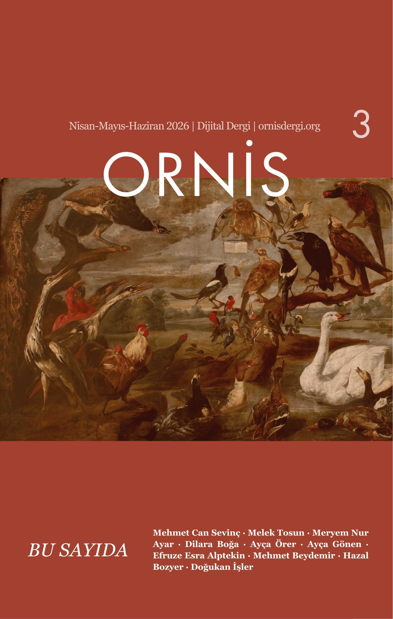 Üç ayda bir yayınlanan Ornis Dergi‘nin üçüncü sayısında, Ayça Örer, Ayça Gönen ve Dilara Boğa’nın öyküleri, Meryem Nur Ayar, Mehmet Can Sevinç ve Melek Tosun’un denemeleri, Efruze Esra Alptekin’in masalı, Doğukan İşler’in tefrika romanı ve Mehmet Beydemir’in Hazal Bozyer ile “Sait Faik’in Ada’sı, İstanbul’u ve Kalemi Üzerine” bir söyleşisi yer alıyor. Derginin tüm sayılarına ornisdergi.org adresinden ulaşabilirsiniz.