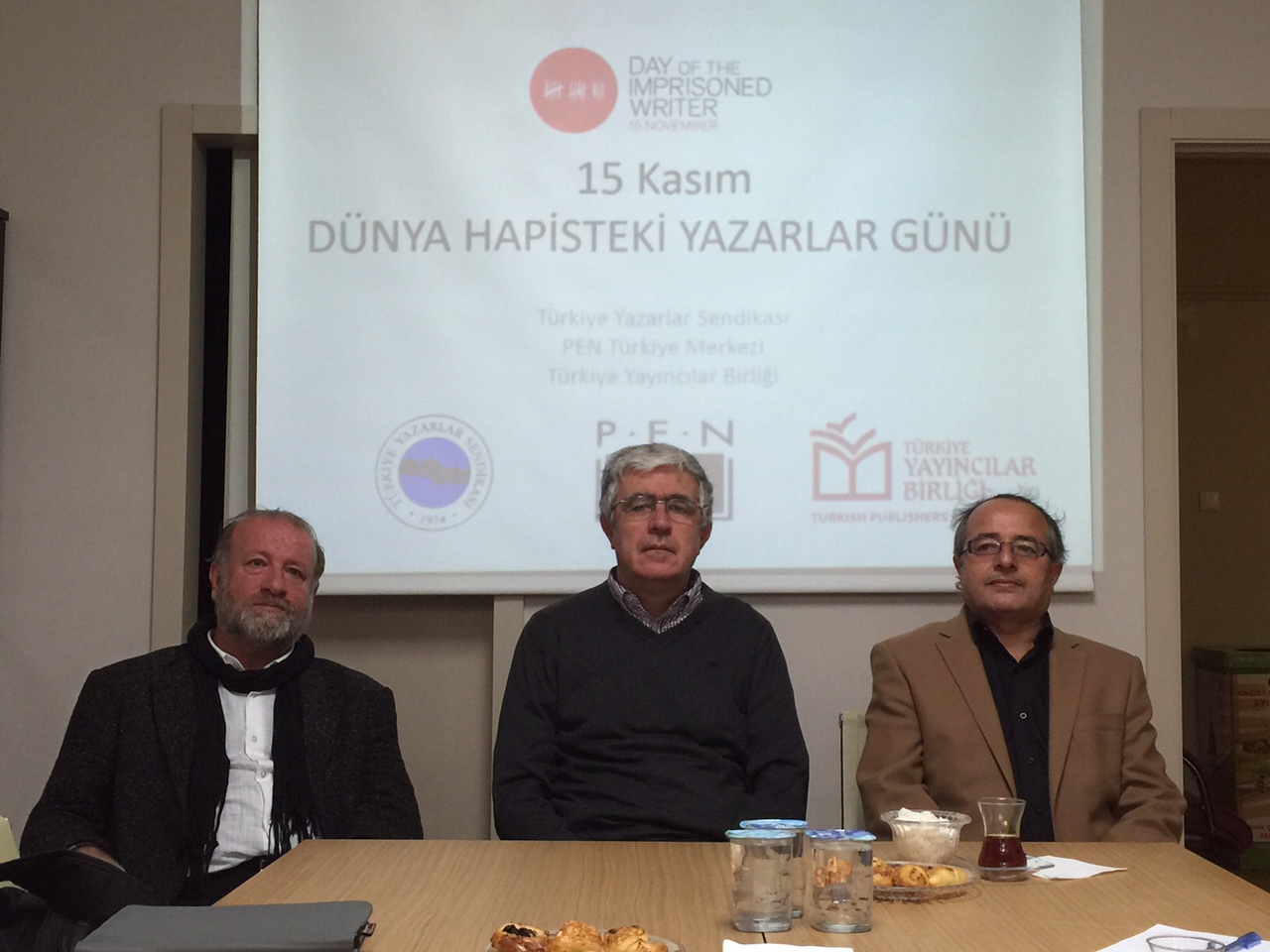 15 Kasım Dünya Hapisteki Yazarlar Günü’nde ortak basın toplantısı düzenleyen PEN Türkiye, Türkiye Yazarlar Sendikası ve Türkiye Yayıncılar Birliği, meslekleri yüzünden özgürlükleri ellerinden alınan yazarların sorunlarına dikkat çekti. Uluslararası PEN’in Dünya Hapisteki Yazarlar Günü ilan ettiği 15 Kasım’da bu yıl da yazıları nedeniyle hapsedilen yazarlara kamuoyunun dikkatini çekmek amacıyla PEN Türkiye Merkezi, Türkiye Yazarlar Sendikası ve Türkiye Yayıncılar Birliği’nin katılımıyla Birliğimizde ortak bir basın toplantısı düzenlendi.