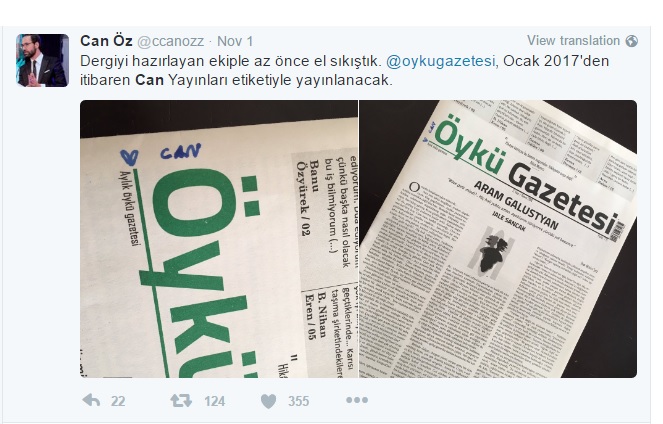 Öykü Gazetesi artık Can Yayınları bünyesinde Kasım 3, 2016 yazar admin Öykü Gazetesi Ocak 2017’den itibaren Can Yayınları bünyesinde yayın hayatını sürdürecek. İşbirliğini, Can Yayınları Genel Müdürü Can Öz kişisel twitter hesabından kamuoyuna duyurdu: edebiyathaber.net (3 Kasım 2016) Beklemeyi bilmek ya da duygunun renkleri | Feridun Andaç“Muazzam Şair Mayakofski Neden İntihar etti?” | Pınar K. ÜretmenDeliler Teknesi dergisinin yeni sayısı çıktıMiyazaki dosyası Altyazı'nın mayıs sayısındaNeslihan Önderoğlu’nun önerdiği 20 kitap | Funda Dörtkaşİzmir Kitap Fuarı 19-27 Nisan tarihleri arasında!