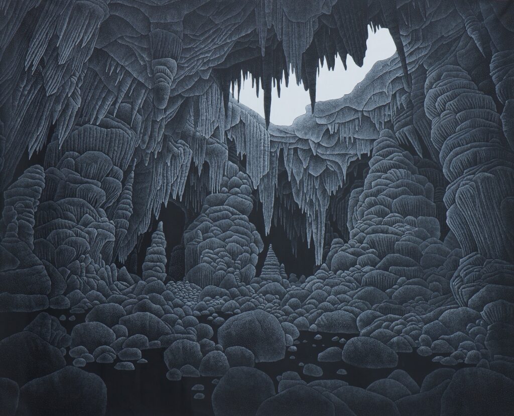 Özge Kahraman, yaklaşık on beş yıldır sürdürdüğü mağara araştırmaları aracılığıyla yeraltını yalnızca keşfedilen fiziksel bir alan olarak değil, varlığın başlangıcını düşünmeye açılan bir eşik olarak ele alır. Sanatçının üretimi, mağaralarda karşılaşılan oluşumları ve bu mekânların yarattığı deneyimi görsel bir dile dönüştürür. Noktalama tekniğiyle oluşturduğu yüzeylerde binlerce nokta bir araya gelerek mineral dokuları, taşın katmanlı yapısını ve zamanın tortulaşmasını çağrıştırır. Her bir nokta, dünyanın derinliklerinde gerçekleşen yavaş oluşum süreçlerinin küçük ama etkili bir izi gibi belirir. Bu nedenle sanatçının işleri, yalnızca bir mekânı temsil etmez; aynı zamanda arkhe kavramını, yani varlığın kökenine dair düşünceyi görünür kılmaya çalışır.