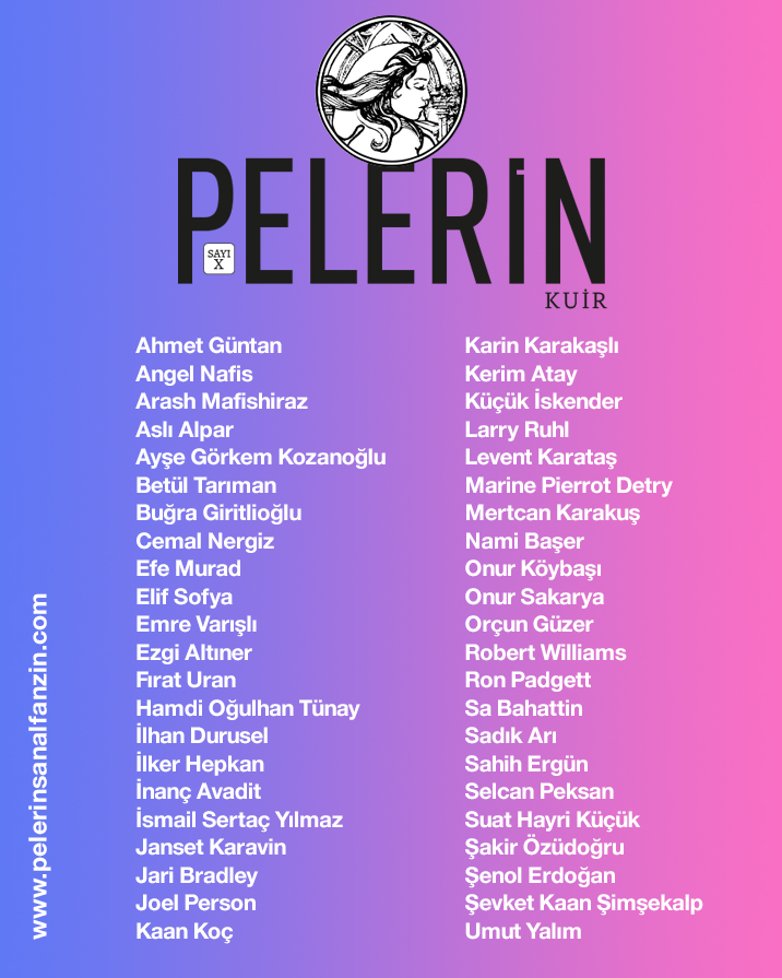 Pelerin Fanzin’in bu sayısında şiir, yazı, çeviri ve görselleri olan isimler ise şöyle: Ahmet Güntan, Angel Nafis (Çeviren: Kerim Atay), Arash Mafishiraz – Ferda Tekinturhan (Çev. Ferda Tekinturhan), Aslı Alpar, Ayşe Görkem Kozanoğlu, Betül Tarıman, Buğra Giritlioğlu, Cemal Nergiz, Efe Murad-Selcan Peksan (Tom Clark), Elif Sofya, Emre Varışlı, Ezgi Altıner, Ferda Tekinturhan, Fırat Uran, Hamdi Oğulhan Tünay, İlhan Durusel, İlker Hepkan, İnanç Avadit, İsmail Sertaç Yılmaz, Janset Karavin, Jari Bradley (Sa Bahattin), Joel Person, Kaan Koç, Karin Karakaşlı, küçük İskender, Larry Ruhl, Levent Karataş, Marine Pierrot Detry, Mertcan Karakuş, Nami Başer, Onur Köybaşı, Onur Sakarya, Orçun Güzer, Robert Williams (Çeviren Sa Bahattin), Ron Padgett, Sa Bahattin, Sadık Arı, Suat Hayri Küçük, Şakir Özüdoğru, Şenol Erdoğan, Şevket Kaan Şimşekalp, Umut Yalım.
