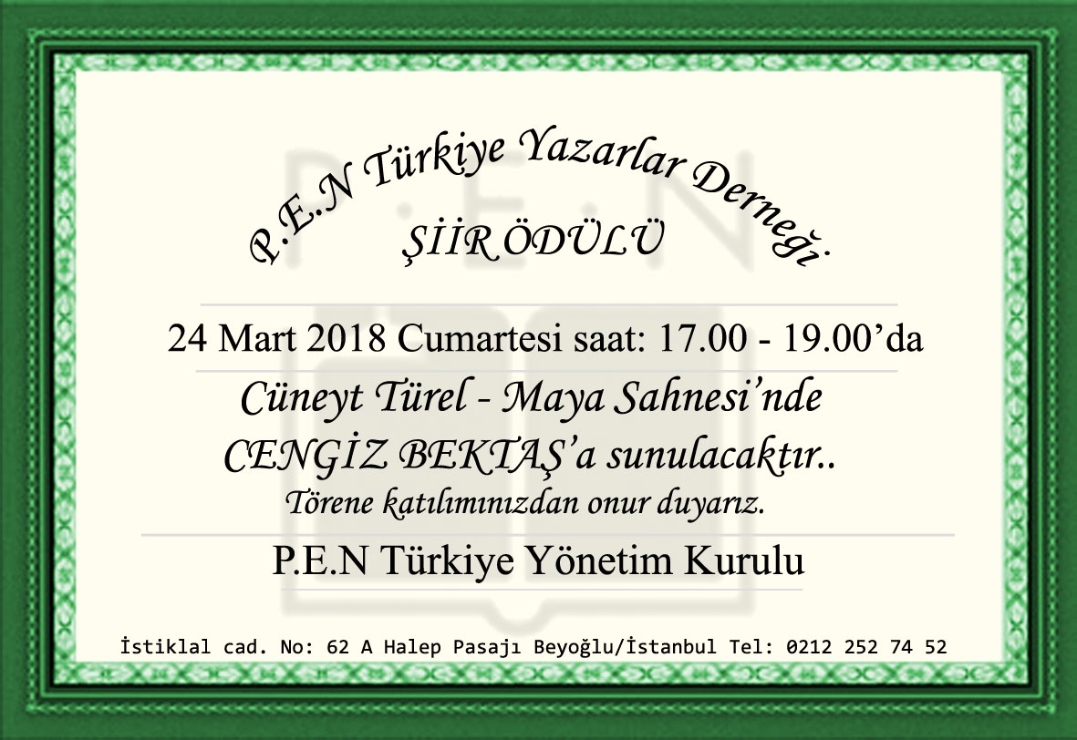 PEN açıklaması şöyle: “24 Mart’ta Dünya Şiir Günü kutlamamızı 2018 PEN Şiir Ödülü’nü değerli mimar ve şair Cengiz Bektaş’a sunuyoruz. Cengiz Bektaş’ı; biçimlendirdiği yapılara kattığı aydınlık gibi şiire de güler yüzlü bir hava katan, şiirinde Akdeniz’den Ege’ye Türkiye’yi ağırlayan, emek yanlısı, insancıl yaklaşımıyla, Türkçe tutkusuyla ve yazarların örgütlü yaşamasının önemini mücadelesiyle vurgulayan örnek bir aydınımız olarak kutluyoruz. Bu ödül daha nice şiirler dileği ve saygımızla bir şükran ifadesidir.”