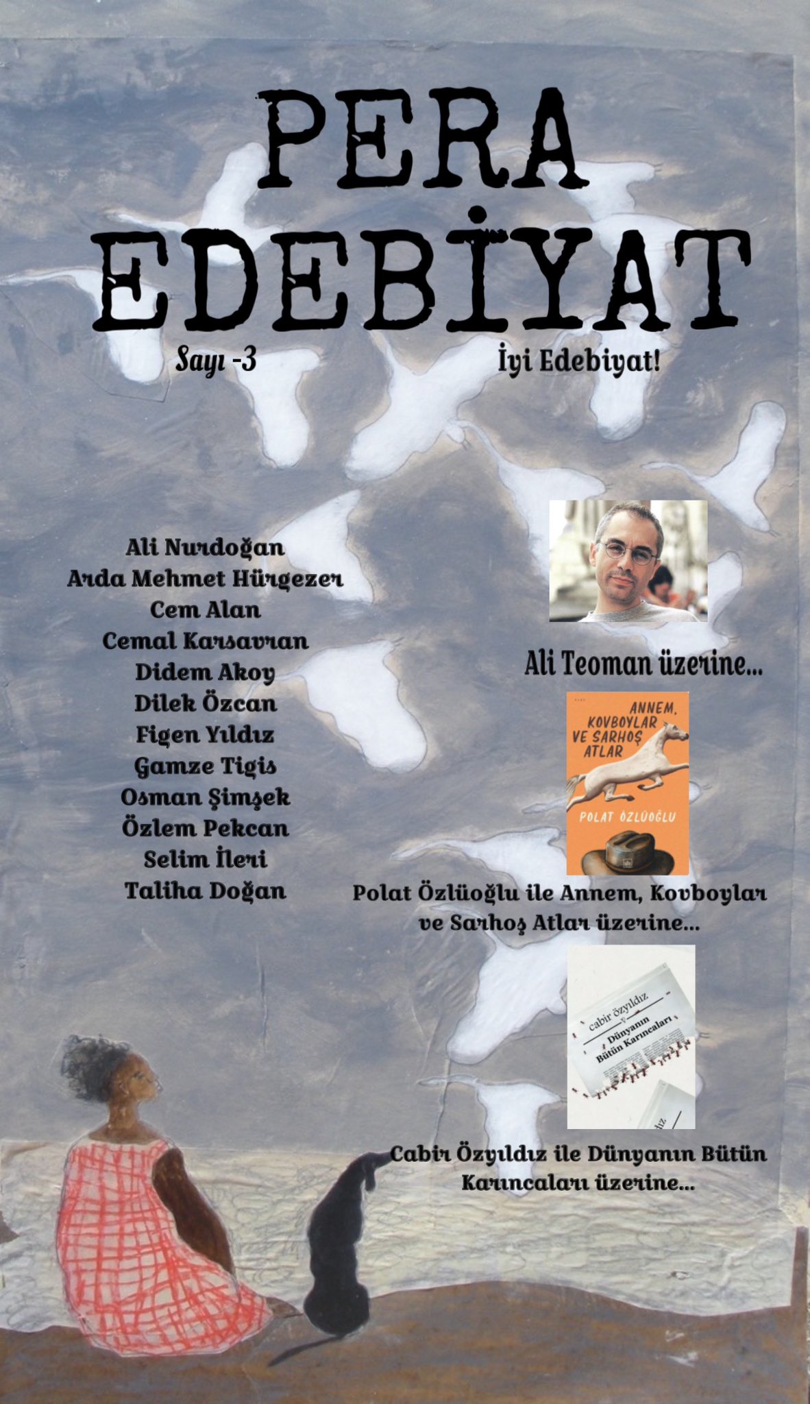 Bu sayının dosya konusu Ali Teoman. Onun edebi mirasına dair kaleme alınan inceleme yazıları, hem edebiyat tarihimize hem de belleğimize kıymetli bir katkı sunuyor. Sayıda ayrıca iki özel söyleşi yer alıyor: Polat Özlüoğlu ile Annem, Kovboylar ve Sarhoş Atlar üzerine; Cabir Özyıldız ile ise Dünyanın Bütün Karıncaları odağında gerçekleşen samimi bir edebiyat sohbeti. Katkı sunan yazarlar arasında Ali Nurdoğan, Arda Mehmet Hürgezer, Cem Alan, Cemal Kavsavran, Didem Akoy, Dilek Özcan, Figen Yıldız, Gamze Tigis, Osman Şimşek, Özlem Pekcan, Selim İleri ve Talha Doğan yer alıyor. Pera Edebiyat, üçüncü sayısıyla da “iyi edebiyat” arayışını sürdürüyor.