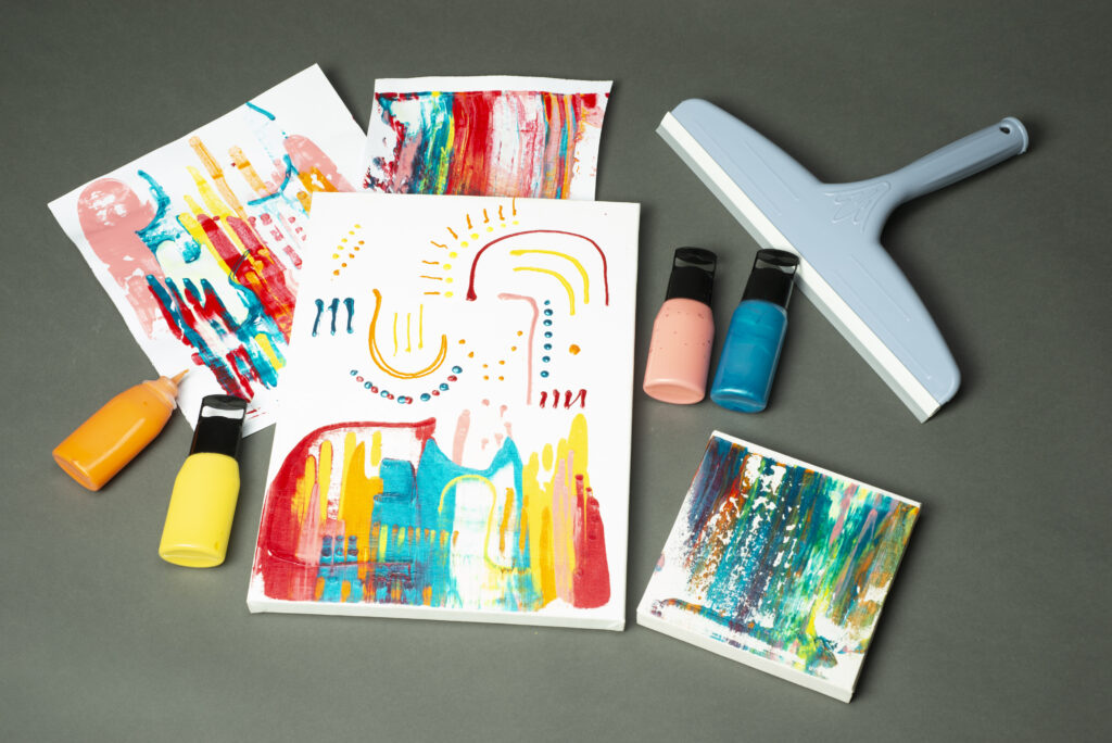 “Tuval Üzerinde Renklerin Yolu” atölyesinde boncuk boyalarla tuval üzerine istenen düzende nokta, çizgi ve şekiller ekleyen çocuklar, boyaları sıyırarak rengârenk tablolar yaratıyor.