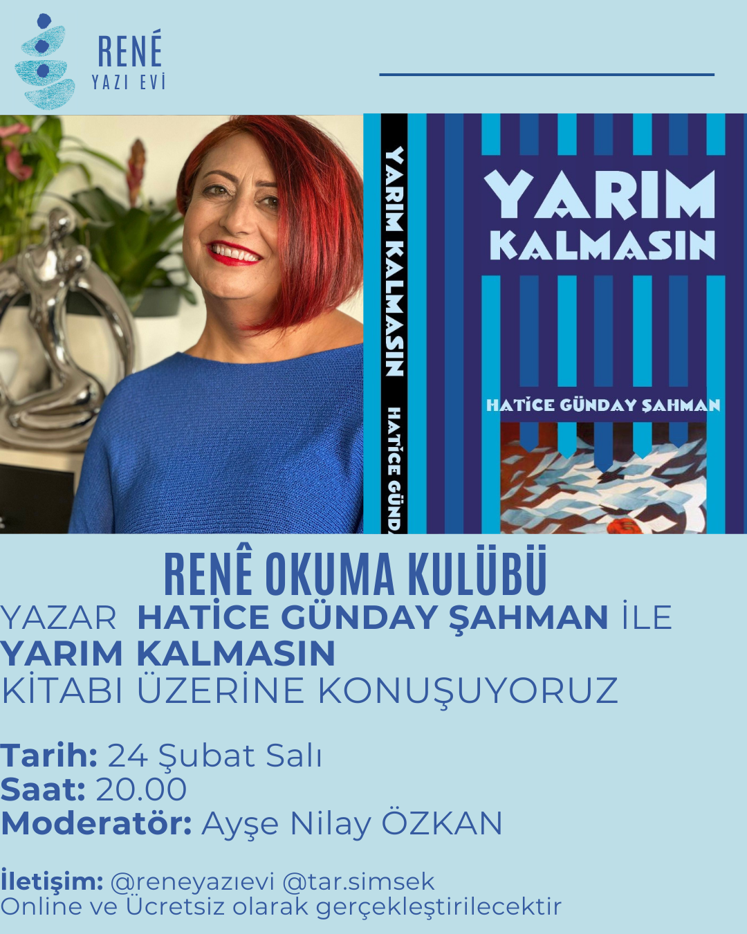 Rene Okuma Kulübü’nün 8. Oturumu konuğu Hatice Günday Şahman Şubat 20, 2026 yazar edebiyathaber Rene Okuma Kulübü’nün 8. oturumu, Yazar Hatice Günday ŞAHMAN’ın ‘ “Yarım Kalmasın” kitabı üzerine, 24 Şubat Saat 20.00’de yapılacaktır. Ayda bir defa olarak planlanan oturumlar da öncelik yerli ve çağdaş öykücülere yer verilecektir. “MASADA: II” 26 Nisan’da Galeri Bu’da ziyarete açılıyor"Perşembe Edebiyat Konuşmaları" sürüyor“Hikâyeden Sonra: Çağdaş Sanat ve Edebiyat” etkinliği 25 Eylül'deHüseyin Taşkın ile Fotoğraf Atölyesi başlıyorAydınlardan "Barış ve Demokrasi" konferansıSibel Oğuz söyleşisi 25 Ocak'ta