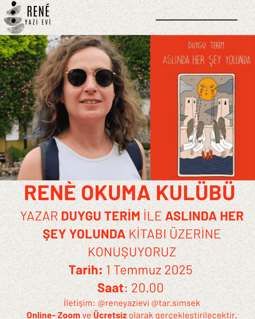 Rene Okuma Kulübü’nün ilk oturumu, Yazar Duygu Terim’in “Aslında Her Şey Yolunda” kitabı üzerine, 1 Temmuz Saat 20.00’de yapılacaktır. Ayda bir defa olarak planlanan oturumlar da öncelik yerli ve çağdaş öykücülere yer verilecektir.