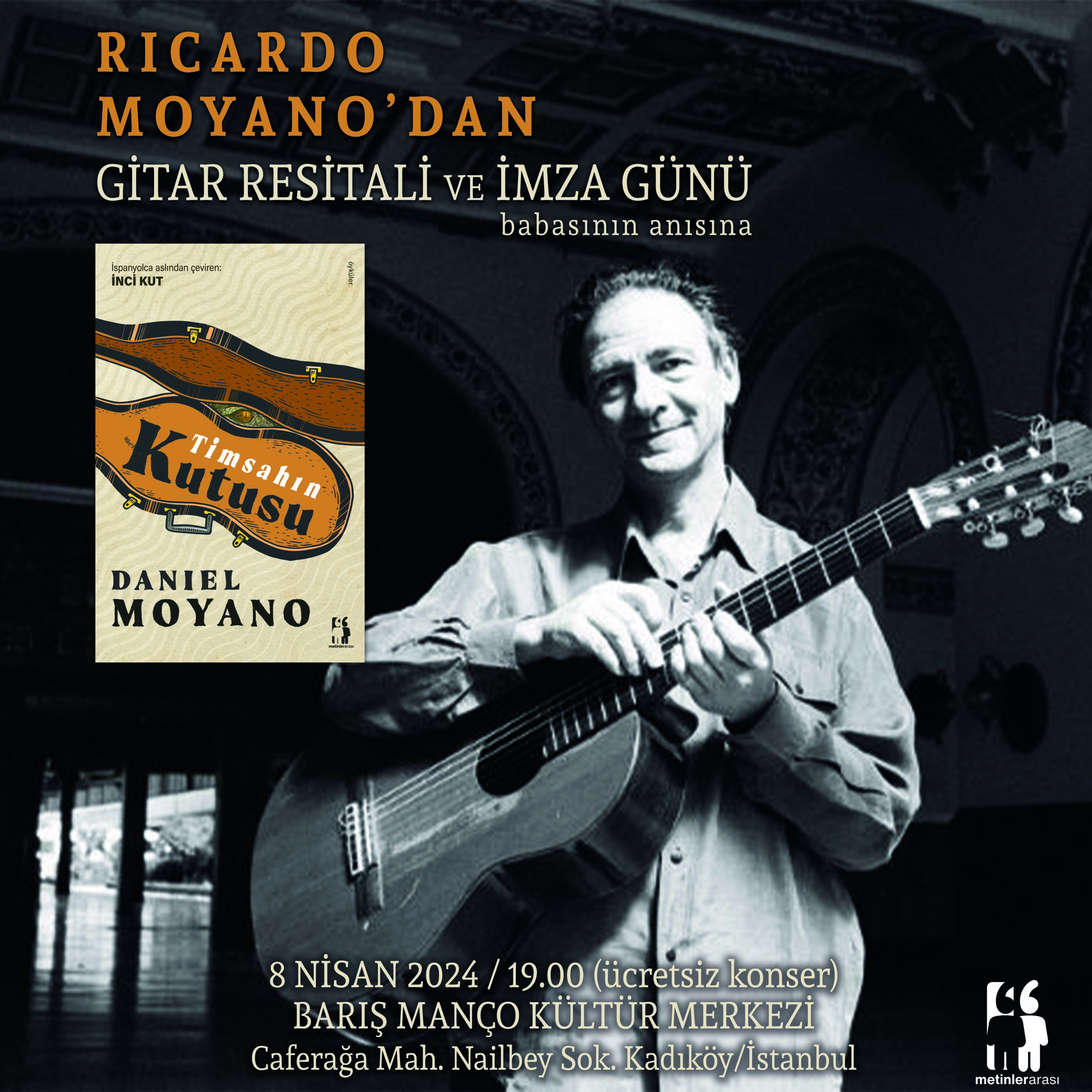 Dünyaca ünlü Latin gitarist Ricardo Moyano, 8 Nisan Pazartesi akşamı saat 19.00’da Barış Manço Kültür Merkezi’nde sevenleriyle birlikte olacak. Ricardo, gitar resitalinin ardından, babası Daniel Moyano’nun İnci Kut çevirisiyle sunduğumuz Timsahın Kutusu adlı kitabını imzalayacak.