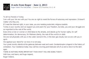 Pink Floyd grubunun kurucusu Roger Waters, Gezi Parkı göstericilerine destek vermek için Facebook sayfasından bir mesaj yayımladı. Mesajın Türkçesi şöyle: