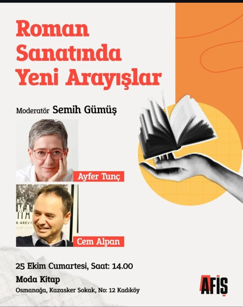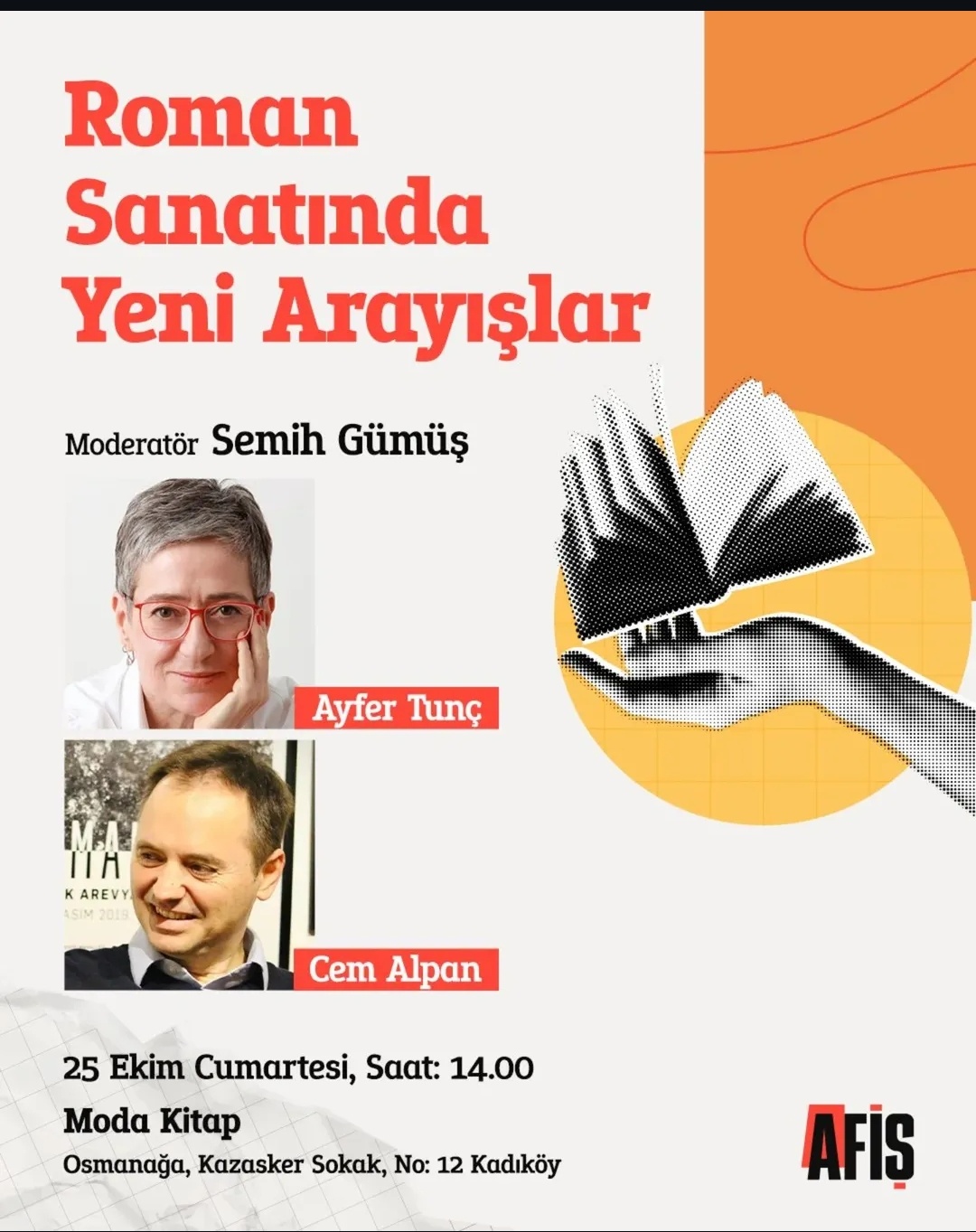 Roman Sanatında Yeni Arayışlar söyleşisi 25 Ekim’de Ekim 15, 2025Ekim 15, 2025 yazar edebiyathaber Semih Gümüş’ün moderatörlüğünde Ayfer Tunç ve Cem Alphan’ın Roman Sanatında Yeni Arayışlar söyleşisi 25 Ekim Cumartesi, saat 14.00’da Moda Kitap’ta. Tanju Okan sahneye taşınıyor“Küçük Prens" bugün Gümüşlük’teKaradeniz 9. Kitap Fuarı, 28 Eylül - 6 Ekim tarihleri arasında kitapseverlerle buluşuyorTayfun Atay'ın Din Antropolojisi seminer dizisi 30 Kasım'da başlıyor"Edebiyat Fakültesinde 'Sus Barbatus!' Okuyoruz" etkinliği 15 Nisan'da14 Şubat Dünya Öykü Günü “İnsan, öyküsüyle var,” diyerek herkese seslenecek!