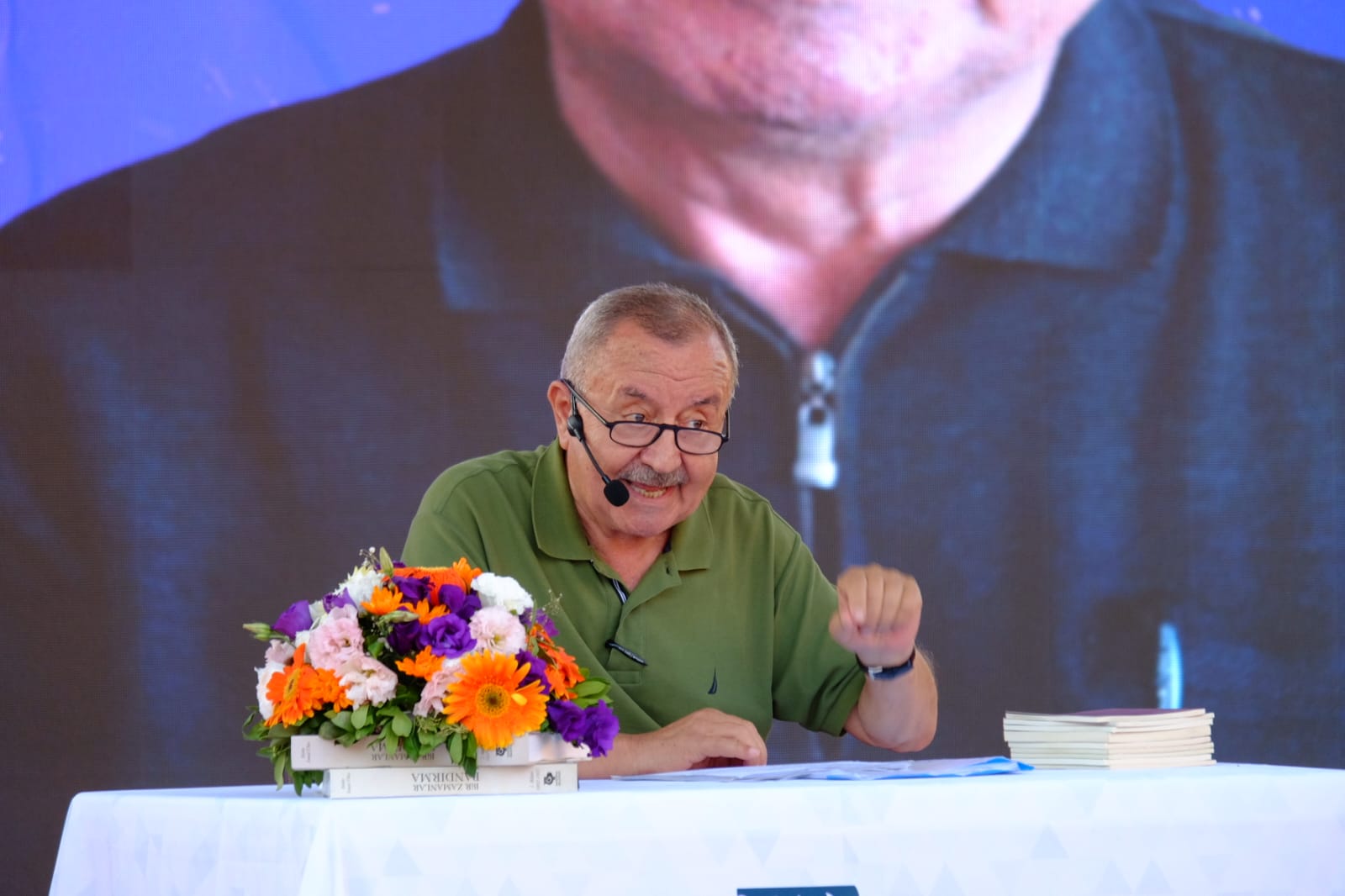 Yeni şiir dosyasının da tamamlanmak üzere olduğunu söyleyen Erbaş, buradan bir şiirini halkın karşısında ilk defa 6. Bandırma Kitap Günleri’nde okudu. Daha sonrasında ise konuştuğumuz dilin kurucusunun ve “dört büyüğünün” Yunus Emre, Pir Sultan Abdal, Karac’oğlan ve Nâzım Hikmet olduğunu söyleyerek, Nâzım’ın “Hatunumun Gözleri Eladır Da” şiirini okudu.