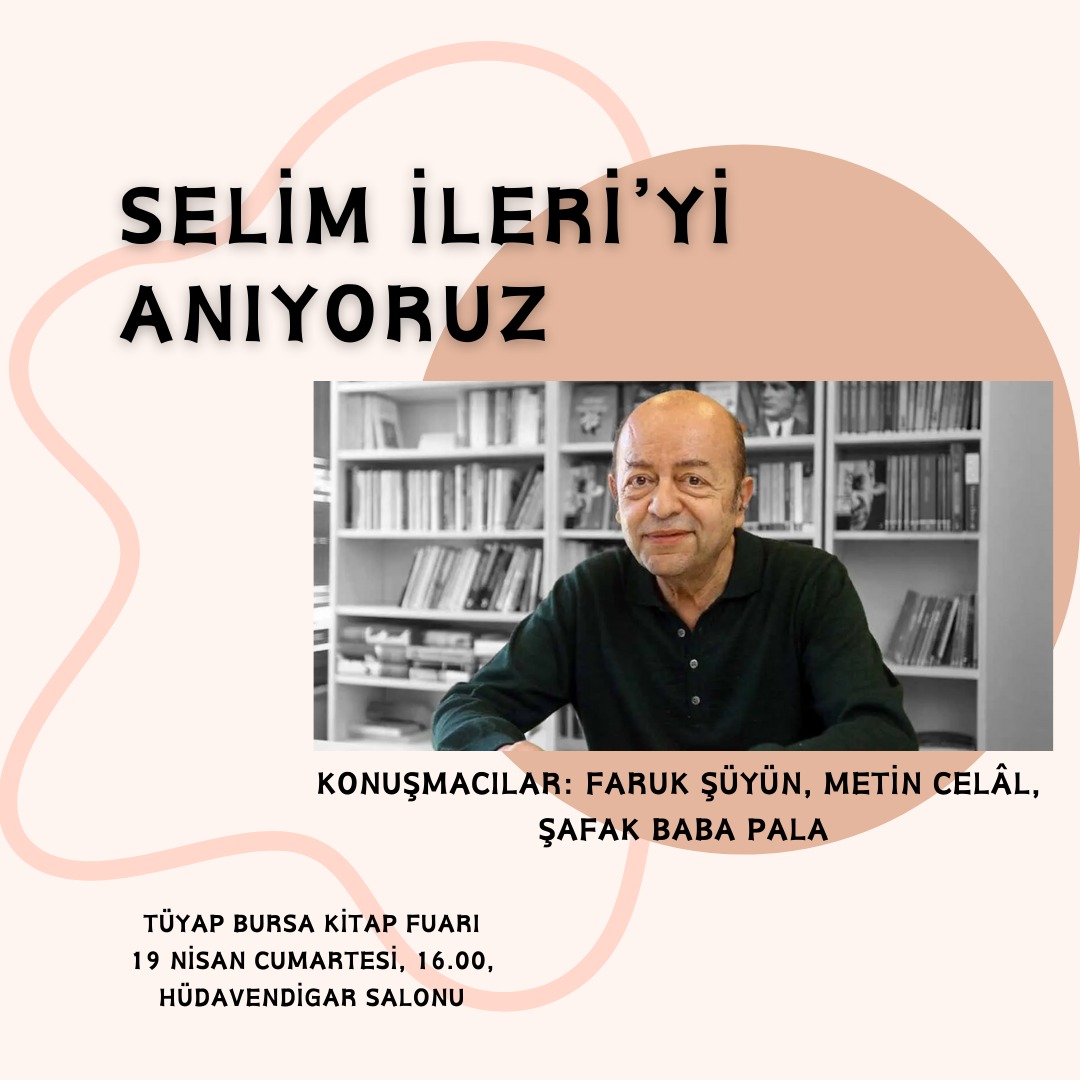 Selim İleri Bursa Kitap Fuarı’nda anılıyor Nisan 11, 2025Nisan 11, 2025 yazar edebiyathaber 8 0cak 2025 tarihinde hayatını kaybeden yazar Selim İleri, 22. Bursa Kitap Fuarı’nda anılıyor. Faruk Şüyün, Metin Celâl, Şafak Baba Pala’nın konuşmacı olan etkinlik 19 Nisan’da Hüdavendigar Salonu’nda saat 16.00’da gerçekleşecek. Yazmak Atölyesi Eylül ayı programı belli olduDevekuşu Kabare Müze Konuşmaları 19 Aralık'ta"Sarkis: Sonsuz" sergi turu 16 Kasım'da Arter'deBatuhan Nar imza günü 16 Nisan'da15. Arkeoloji Sempozyumu İtalyan Kültür Merkezi’nin organizasyonuyla 4 Ekim’de gerçekleşecekPoetik Bir Performans Olarak Plan Çizimi semineri 1 Haziran'da
