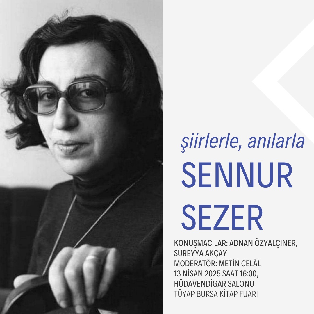 Sennur Sezer Bursa Kitap Fuarı’nda anılıyor Nisan 12, 2025 yazar edebiyathaber Şair Sennur Sezer, Bursa Kitap Fuarı’nda anılıyor. Adnan Özyalçıner ve Süreyya Akçay’ın konuşmacı Metin Celâl’ın de moderatör olacağı etkinlik 13 Nisan saat 16.00’da Hüdavendigar Salonu’nda gerçekleşecek. edebiyathaber.net (12 Nisan 2025) Sarıyer Edebiyat Günleri 13-15 Mayıs’ta"Eğitimde edebiyat" buluşması 12 Ekim'de İstanbul'daTürk resminin modernleşme süreci Arkas Sanat Merkezi’nde mercek altındaAhmet Ümit “Elveda Güzel Vatanım” ile Pera Palace Hotel Jumeirah’ta"Benim Ankaram: Bir Arada Edebiyat Söyleşisi" 14 Kasım'daNedim Gürsel edebiyatta 50. yılını kutladı