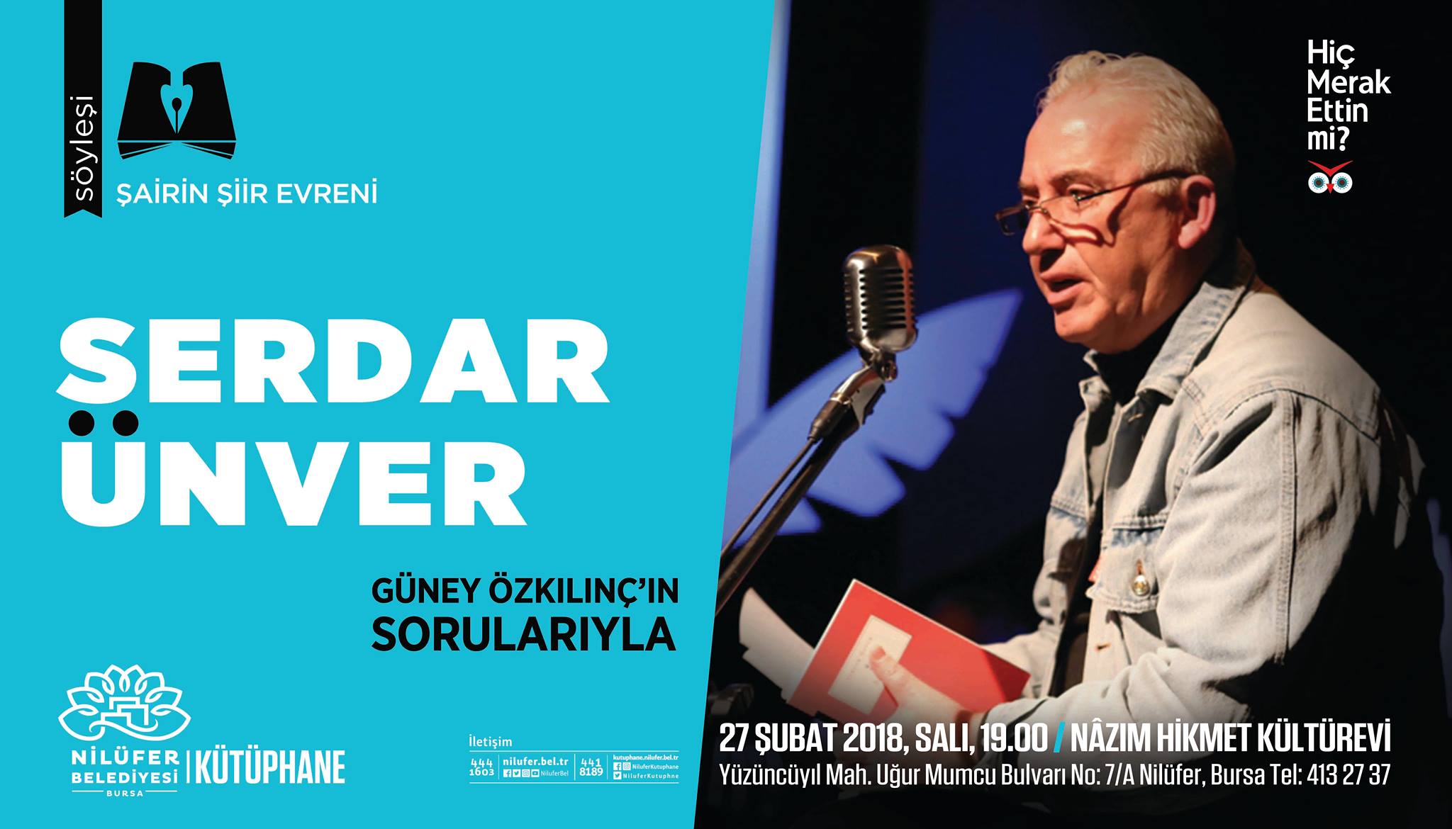 Nilüfer Belediyesi Kütüphanelerinin düzenlediği Şairin Şiir Evreni söyleşisine Bursalı şair Serdar Ünver konuk oluyor. Serdar Ünver ile Şairin Şiir Evreni söyleşisi, 27 Şubat, Salı 19.00’da, Nazım Hikmet Kültürevi’nde gerçekleşiyor.
