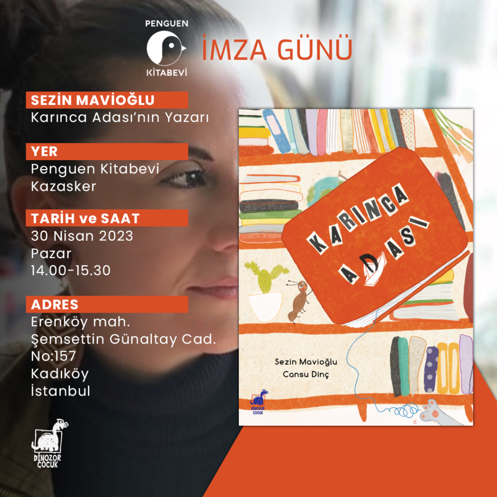 Sezin Mavioğlu, Dinozor Çocuk’tan çıkan Karınca Adası adlı resimli kitabını 30 Nisan Pazar günü 14.00-15.30 saatleri arasında Penguen Kitabevi Kazasker’de imzalayacak! Karınca Adası’nda minik okurlar, sığındığı bir “kitap evi”nde kitapların zengin dünyasına dalan bir karıncayla birlikte hem eğlenceli hem de öğretici bir yolculuğa çıkıyorlar.