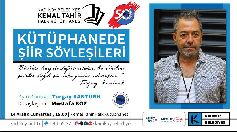 Şiir Söyleşileri konuğu Turgay Kantürk Aralık 13, 2024 yazar edebiyathaber Türkiye Yazarlar Sendikası (TYS) ve Kadıköy Belediyesinin iş birliğiyle düzenlenen Şiir Söyleşileri’nin konuğu Turgay Kantürk olacak. Etkinlik 14 Aralık Cumartesi saat 15.00’te Kemal Tahir Halk Kütüphanesi’nde. edebiyathaber.net (13 Aralık 2024) Tuğçe Altuğ ve Deniz Celiloğlu’ndan “Nora (Bir Bebek Evi)” 28. İstanbul Tiyatro Festivali kapsamında...Buket Uzuner: "Samimi bir yazar, okumak istediği kitabı yazar."Felsefe seminerleri başlıyorAnkara Öykü Günleri 2 Mayıs'ta başlıyorInstitut français, Türk sanatçılar için Fransa’da konuk sanatçı programları sunuyorTehlikeli Oyunlar söyleşisi 12 Ekim'de