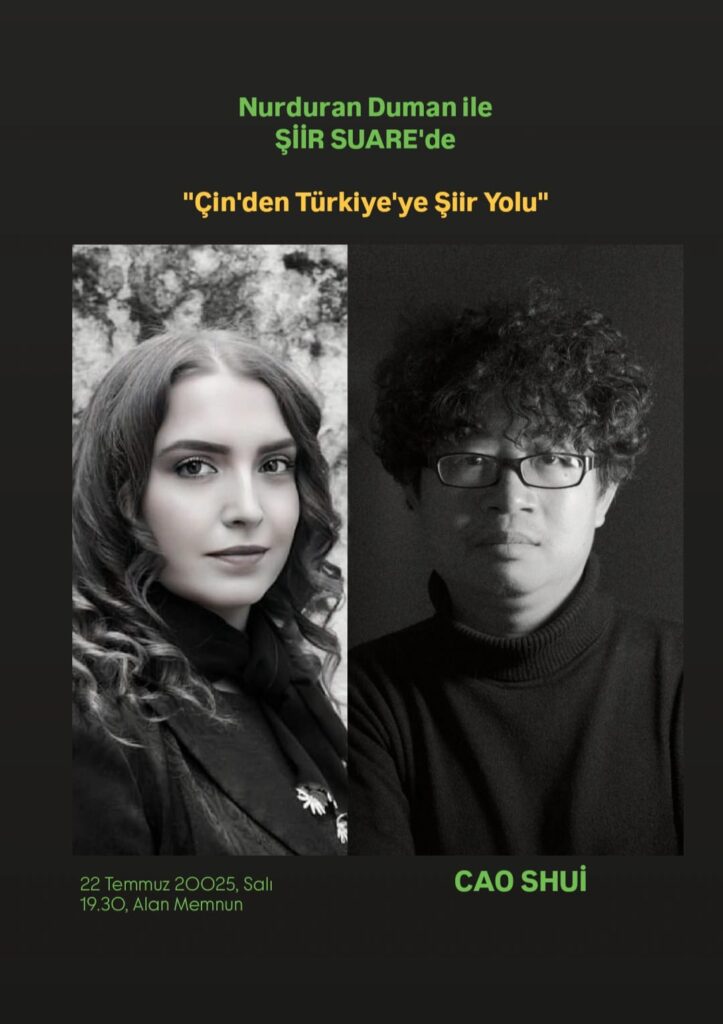 “Kültür sanat edimlerinin durağan geçtiği dönem diye bilinen ezberi bozduğumuz Yaz mevsimi üretimlerimizi hızımızı yükselterek sürdürüyoruz. Önümüzdeki hafta Şiir Suare’de Çin’den, sonraki hafta da Japonya’dan şair konuklarımız olacak. Dünyamız şiirle biraz daha güzelleşecek, üstelik çok uzaklardan gelen iki kadim kültürün selamı ile” diyen Nurduran Duman, Şiir Suare’de aralarında başka ülkelerden sanat insanlarının da olduğu uluslararası imzaları konuk etmeyi sürdürüyor. Katılımcıların yanına ister yazdığı ister sevdiği şiiri ya da şiir sevgilerini alıp gidebildiği, farklı disiplinlerdeki ilgi ve meraklarını doyurup deneyim ve birikimlerini paylaşabildiği etkinlik dizisinde, daha önce Küba, ABD/Pakistan, Çin, Hindistan, Belçika gibi ülkelerden şairleri, sanat insanları konuk edilmişti. Şiirle birlikte başka alanları harmanlamayı gözeten, bu harmanın, bütüncül anlayışın dünyanın temel gereksinimlerinden olduğunu savunan etkinlik dizisinin yeni ayağında ise 22 Temmuz 19.30’da Çinli konuk şair Cao Shui ile “Çin’den Türkiye’ye Şiir Yolu” işlenecek.