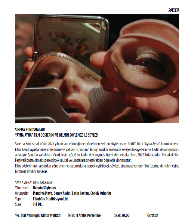 Sinema Konuşmaları’nın 2025 yılının son etkinliğinde, yönetmen Belmin Söylemez ve ödüllü filmi “Ayna Ayna” konuk oluyor. Film, kendi ayakları üzerinde durmaya çalışan üç kadının bir oyunculuk kursunda kesişen hikâyelerini ve kadın dayanışmasını anlatıyor. Sanatla var olma mücadelesini güçlü bir kadın dayanışması üzerinden ele alan film, 2022 Antalya Altın Portakal Film Festivali başta olmak üzere birçok ulusal ve uluslararası festivalden ödüllerle dönmüştür. Film gösteriminin ardından yönetmen ve oyuncularla gerçekleştirilecek söyleşi, sinemaseverlere film üzerine derinlemesine bir bakış imkânı sunacak.