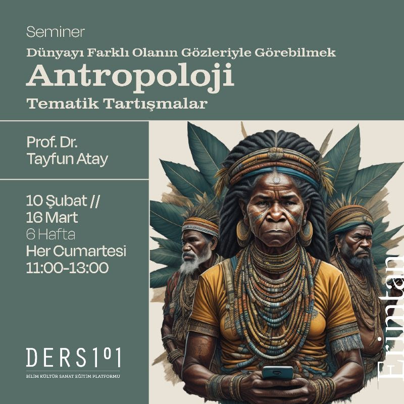 Tayfun Atay ile ANTROPOLOJİ – Tematik Tartışmalar “Dünyayı Farklı Olanın Gözleriyle Görebilmek” seminer dizisi, 10 Şubat-16 Mart 2023 Cumartesi günleri, Ders101 Eğitim Platformu ve Erimtan Arkeoloji ve Sanat Müzesi işbirliğiyle düzenleniyor.