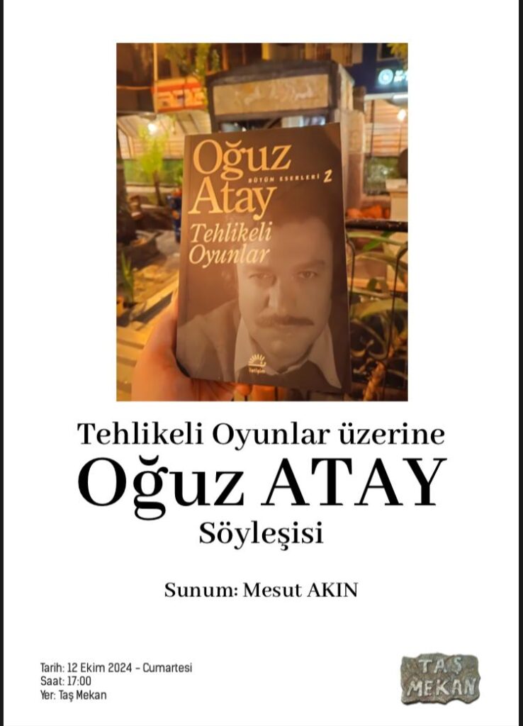 Tehlikeli Oyunlar söyleşisi 12 Ekim’de Ekim 5, 2024 yazar edebiyathaber 12 Ekim Taş Mekan’da Oğuz Atay’ın Tehlikeli Oyunlar adlı romanı üzerine söyleşi gerçekleşecek. Mesut Akın sunumuyla gerçekleşecek olan söyleşi saat 17.00’de başlayacak. edebiyathaber.net (5 Ekim 2024) “Kitaba Dönüşmek” programında, Rita Ender "İsmiyle Yaşamak" adlı kitabını anlatıyorEngelsiz Filmler Festivali “Çocuklar İçin” seçkisiyle sinemayı keşfe çağırıyorİTÜ Edebiyat Kulübü İhsan Oktay Anar'ı ele alıyorTürk Film Araştırmalarında Yeni Yönelimler Konferansı: Sinema ve Bellek"Leylâ Erbil’den Kalan" etkinliği 12 Ocak’taMülkiyeliler Birliği Edebiyat Kulübü Kasım Ayı toplantısında, Nikos Kazancakis’in “Zorba" romanını t...