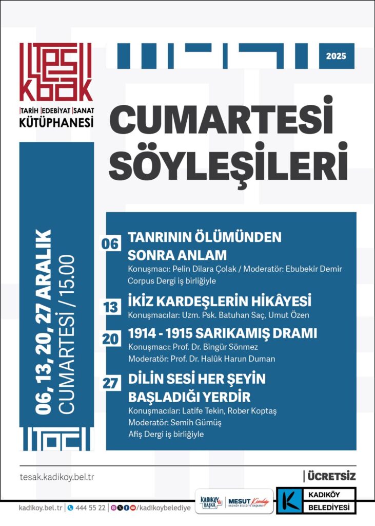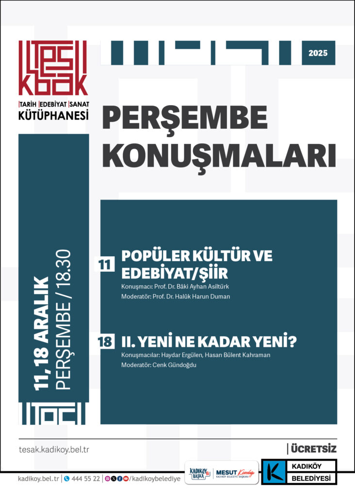 TESAK Aralık 2025 programı belli oldu Aralık 5, 2025 yazar edebiyathaber TESAK Aralık 2025 programı belli oldu. Etkinliklerle ilgili detaylı bilgi için >>> Maltepe Kitap Günleri başlıyorFüruzan, İzmir’de anılıyorOKUYAY Platformu Çizgi ve Sahaf Günleri'ne katılıyorNâzım Hikmet doğumunun 123. yılında Şişli'de anılıyorİzmir'de "Öykü Günleri" başlıyor4. Kara Hafta Festivali’nde Mike Hammer rüzgarı esecek