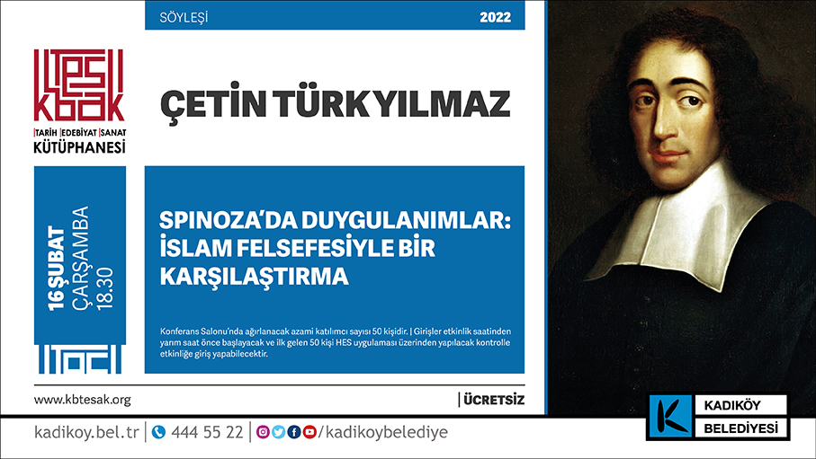 Kadıköy Belediyesi Tarih Edebiyat ve Sanat Kütüphanesi’nde (TESAK) düzenlenen TESAK Çarşamba Akşamüstü Söyleşileri serisinde 16 Şubat Çarşamba saat 18.30’da akademsiyen Çetin Türkyılmaz, Spinoza‘da Duygulanımlar: İslam Felsefesiyle Bir Karşılaştırma başlıklı bir sunum gerçekleştirecek.