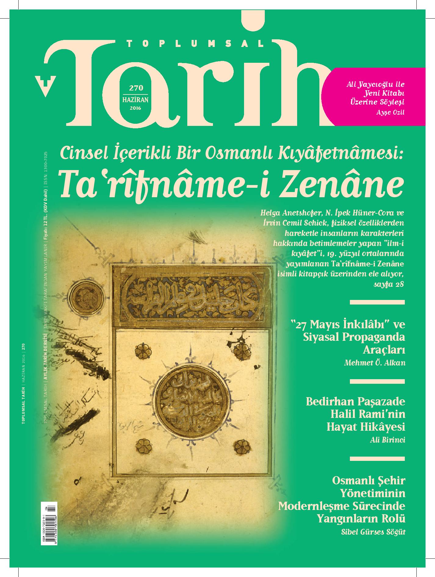 Toplumsal Tarih Haziran 2016 tarihli 270. sayısında “Cinsel İçerikli Bir Osmanlı Kıyafetnamesi: Ta‘rîfnâme-i Zenâne” başlıklı makaleyi kapağa taşıyor.