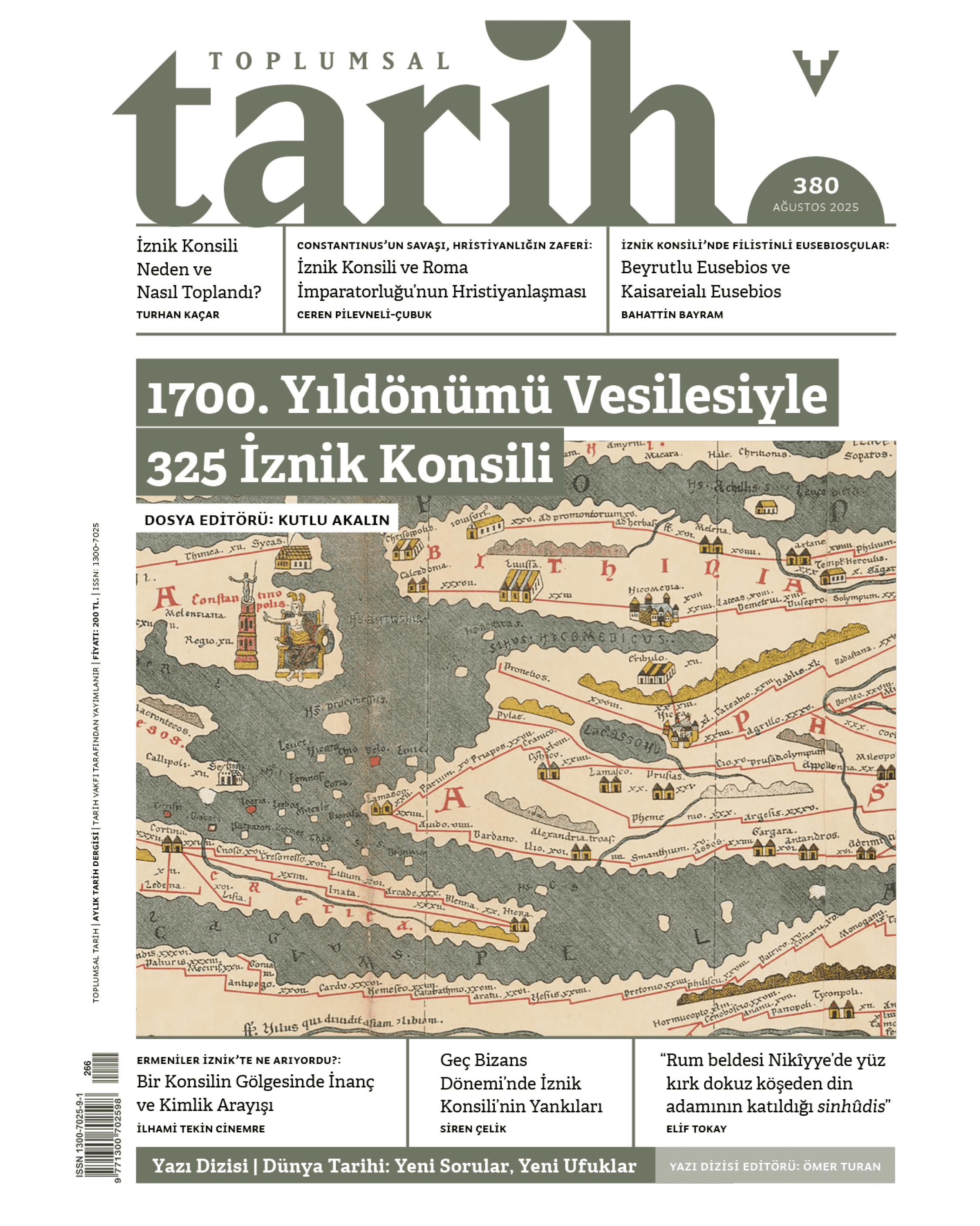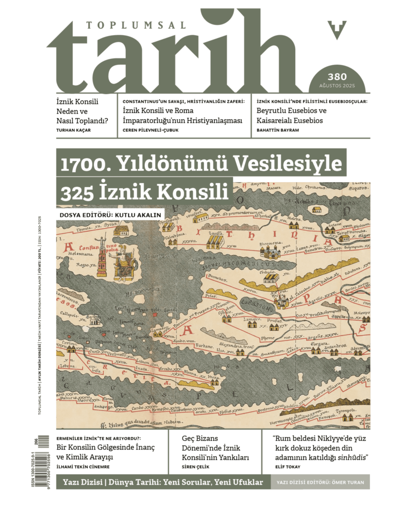Toplumsal Tarih’in Ağustos dosyası, bu sene 1.700 yılını dolduran 325 İznik Konsili’ne ayrıldı. Dosya editörü Kutlu Akalın ve dosya yazarları, bu sene ikinci baskısı yapılan İznik Konsili’nin Siyasi ve Entelektüel Tarihi (ed. Turhan Kaçar, Türk Tarih Kurumu) kitabında yer verdikleri araştırmaları Toplumsal Tarih için yeniden ele aldı ve bazı yeni çalışmalar da ekledi.