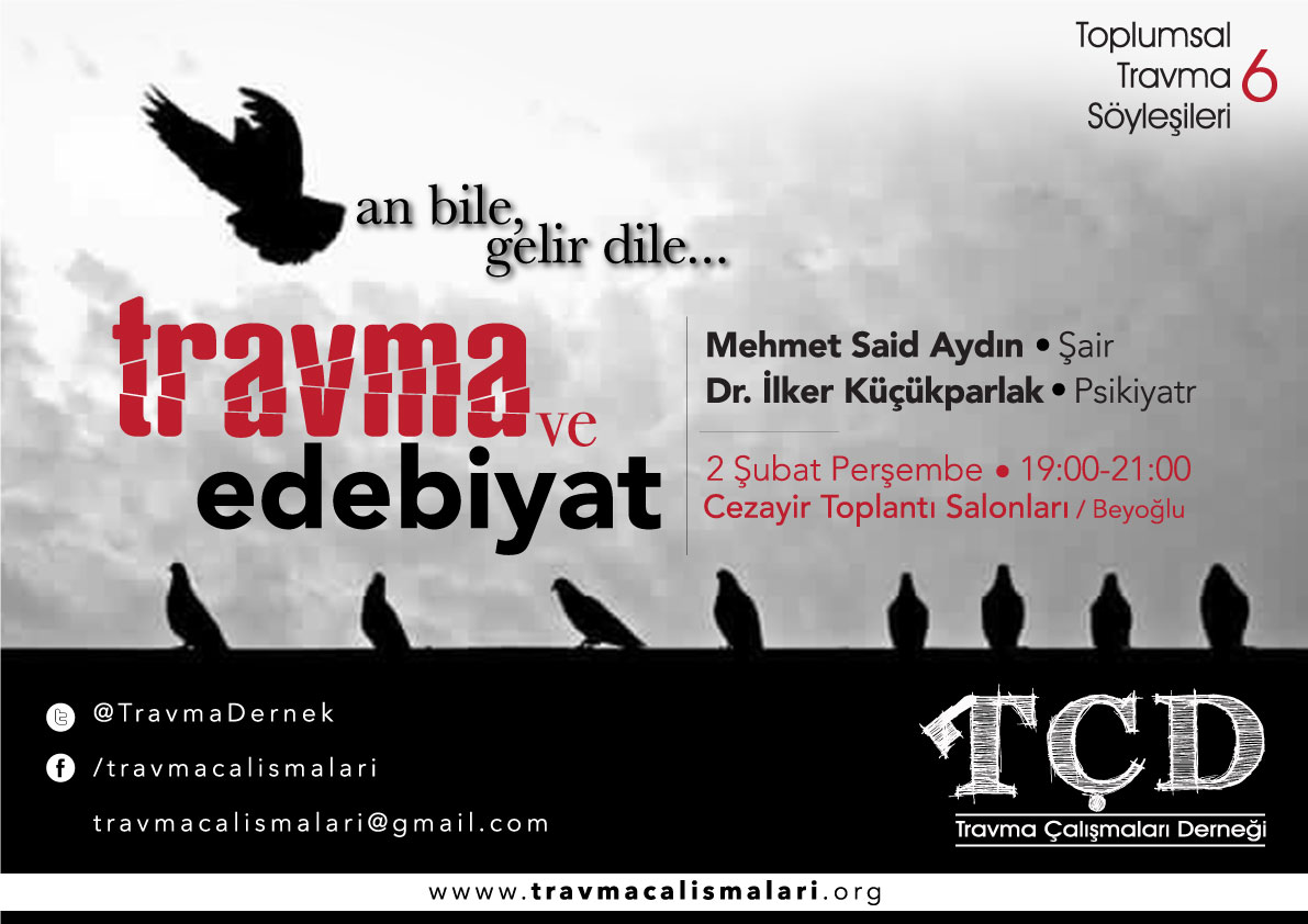 Travma Çalışmaları Derneğinin düzenlediği, şair Mehmet Said Aydın ve psikiyatr İlker Küçükparlak’ın konuşmacı olarak katılacağı “an bile, gelir dile… Travma ve Edebiyat” başlıklı söyleşi, 2 Şubat Perşembe 19:00’da arasında Cezayir Toplantı Salonları’nda gerçekleşecek.