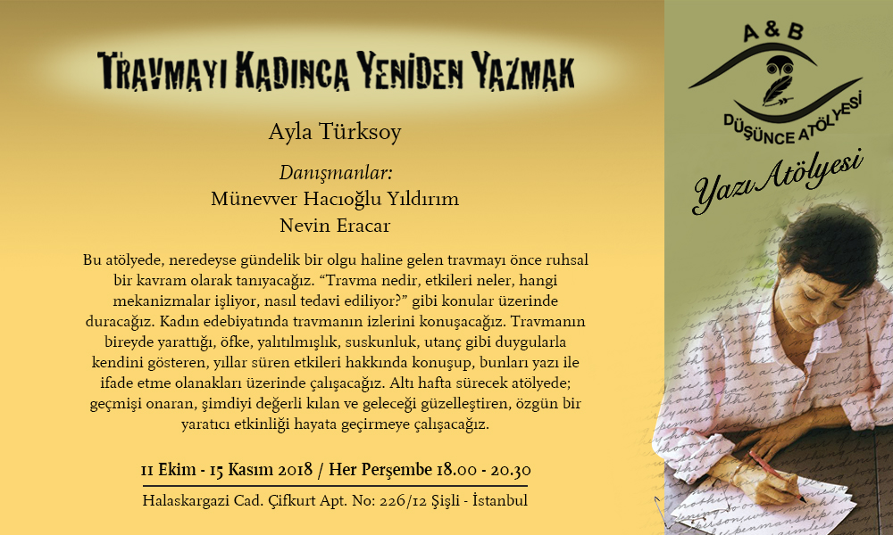 “Travmayı Kadınca Yeniden Yazmak” atölye çalışmasında, bireysel ya da toplumsal örselenmişliklerimiz göz önüne alınarak, neredeyse gündelik bir olgu haline gelen travmayı öncelikle ruhsal bir kavram olarak tanıyacağız. “Travma nedir, etkileri neler, hangi mekanizmalar işliyor, nasıl tedavi ediliyor?” gibi konular üzerinde duracağız. Travmanın bireyde yarattığı, kimi zaman öfke, yalıtılmışlık, suskunluk ya da utanç gibi duygularla kendini gösteren ve uzun yıllar süren etkileri hakkında bilgiler alacağız.