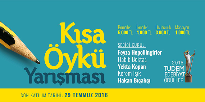 Tudem Kısa Öykü Yarışması 2016 yılı seçici kurulunda ise Feyza Hepçilingirler, Habib Bektaş, Yekta Kopan, Kerem Işık ve Hakan Bıçakçı yer alıyor. 10-12 yaş grubuna yönelik kısa öykülerin yarışacağı yarışmaya başvurmak için, 18 yaşını doldurmuş olmak, her biri 750 kelimeden oluşan toplam 5 adet öyküyle katılım şartları aranıyor. Yarışma ödülleri, birinci öykü için 5 bin TL, ikinci öykü için 4 bin TL üçüncü öykü için 3 bin TL ve mansiyon için bin TL olarak belirlenirken, yarışmaya son başvuru tarihi 29 Temmuz 2016.