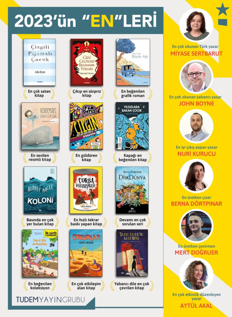 TUDEM Yayın Grubuna göre 2023’ün “en”leri Ocak 3, 2024 yazar admin TUDEM Yayın Grubu 2023’ün “en”lerini açıkladı. edebiyathaber.net (3 Ocak 2023) Erol Büyükmeriç'ten çocuklara: "Kanatlı Düşler"İdil Pişgin Talan'dan ''Gemideki Cesur Ses''Mantık Kraliçesi Neşe Mutsuzgil KamptaSımsıcak bir okul öncesi kitabı: "Gece Diye Bir Şey Yoktur!"Dans Eden Adamlar hikâyesi çocukları zekâ ve cesaret dolu bir yolculuğa çıkarıyorÇocuk edebiyatının sevilen yazarlarından Sevim Ak'tan doğanın iyileştiriciliğine dair bir kitap: "He...