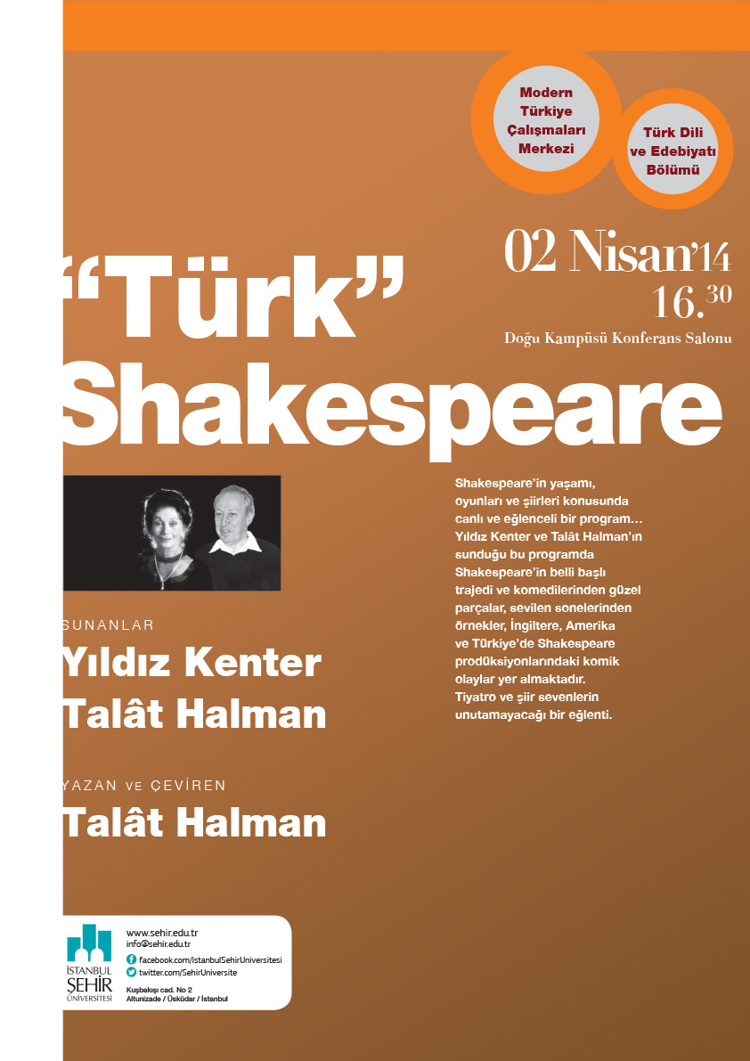 “Türk” Shakespeare etkinliği 2 Nisan’da! Ocak 1, 2014 yazar admin Talat Halman ve Yıldız Kenter’in katılacağı “Türk” Shakespeare etkinliği 2 Nisan’da saat 16.30’da İstanbul Şehir Üniversitesi’nde gerçekleştirilecek. Marquez'in sağlık durumu iyiye gidiyor!Nazım Hikmet'ten çizgi filmler!John Lennon'ın el yazısından albüm taslaklarıYazarın Odası: Merve Yakut | Meltem DağcıAyça Erkol'dan "Marifet" adlı öykü"Toplu Oyunları 1: Aşiyan-Manik Atak-Ortanca" ile ümitleriniz şenlenecek | Gizem Demir
