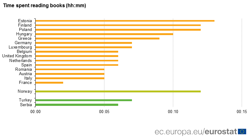 Avrupa İstatistik Ofisi (Eurostat), 23 Nisan Dünya Kitap Günü nedeniyle 15 ülkede 2008-2015 yılları arasında yapılan araştırmanın sonucunu yayımladı. Araştırmaya göre, Türkiye’de kitap okumaya ayrılan süre Fransa, İtalya, Avusturya ve Romanya’nın önünde yer alıyor.