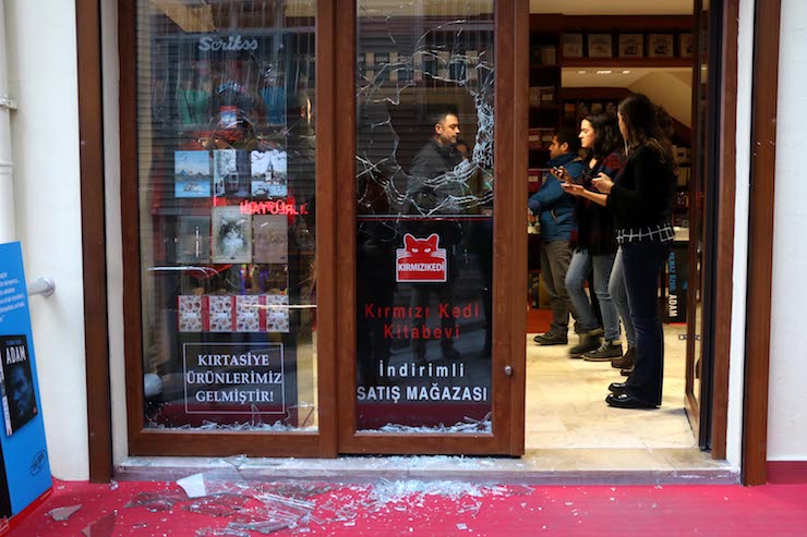 “Kırmızı Kedi Yayınları’nın Kabataş’taki ofisine bugün maskeli iki kişi tarafından saldırı düzenlenmiştir. Saldırganlar yayınevinin camlarını kırarak içeri girmiş, çalışanlara piyasaya çıkmadan hakkında toplatma kararı verilen Sabahattin Önkibar’ın Devlet Bahçeli ve Ülkücüler Hakkında Her Şey isimli kitabıyla ilgili olarak yazara yönelik tehditlerde bulunmuşlardır.