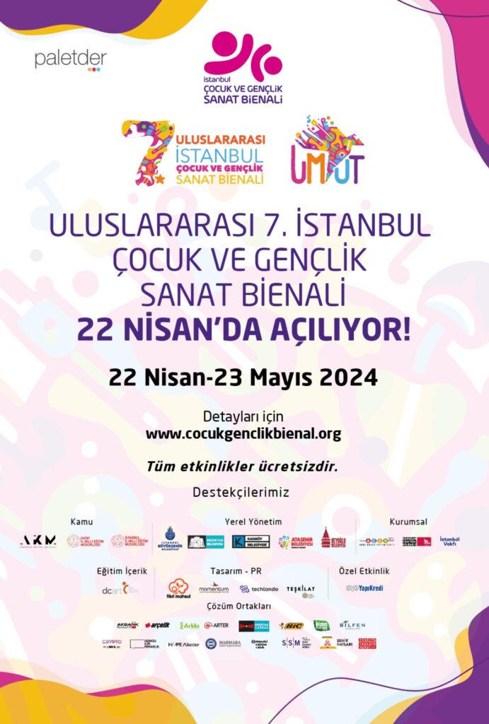 7. İstanbul Çocuk ve Gençlik Sanat Bienali’nin konsepti bu yıl ‘Umut’ olarak belirlendi. Bienal, mevcut gerçeklikten daha iyi bir geleceği hayal etmeyi ve hayalleri gerçeğe çevirmek üzere olan fikirlerin ilhamı olan sanatın farklı dallarını bulmak için yola çıkıyor. Bu yıl deprem bölgesindeki çocukların projelerinin de yer aldığı bienalde STK’lar, bilim, sanat, edebiyat, yaratıcı yazarlık, dijital, teknoloji, dezavantajlı gruplar, iklim öncüleri, deneyim paylaşımı, hayallerin gerçekleştirilmesi, iklim krizi, iklim adaleti, kapsayıcılık gibi alanlarında umudu yeşertmek için neler yapılabileceği sorusuna yanıt arayan çocuk ve gençlere destek olacak.