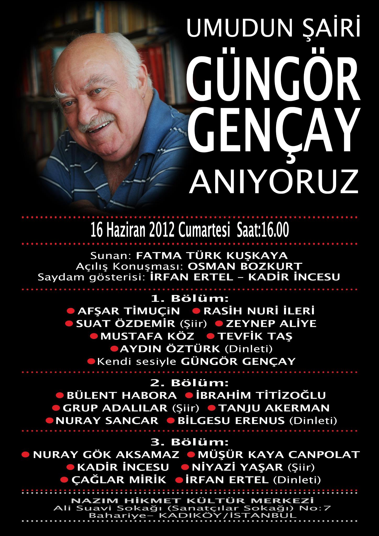 Fatma Türk Kuşkaya’nın sunacağı etkinlikte İrfan Ertel ve Kadir İncesu’nun hazırladığı saydam gösteriminin yanı sıra Osman Bozkurt, Afşar Timuçin, Bülent Habora, Bilgesu Erenus, Rasih Nuri İleri, Mustafa Köz, Suat Özdemir, Zeynep Aliye, Aydın Öztürk, Tevfik Taş, İbrahim Titizoğlu, Grup Adalılar, Tanju Akerman, Nuray Sancar, Müşür Kaya Canpolat, Kadir İncesu, Niyazi Yaşar, Çağlar Mirik ve İrfan Ertel; Güngör Gençay’ı anlatıp şiirlerini okuyacaklar.