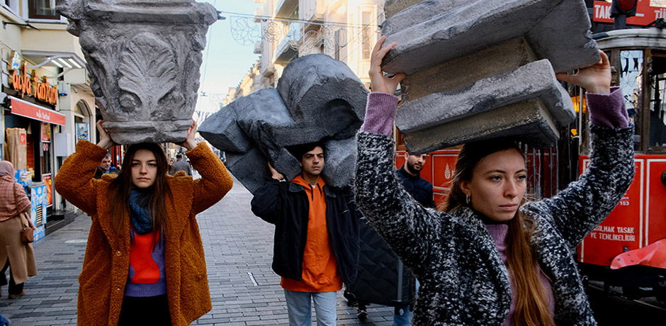 Sena Başöz’ün “İyileşme Olasılıkları” sergisi için yeni ürettiği “Geçit Töreni” isimli yerleştirmesi, Beyoğlu’nun kendisi gibi çok katmanlı bir çalışma. İstiklal Caddesi’nden ağır bina parçalarını taşıyarak geçen ve bu parçalarla oyun oynayan performansçıları izlediğimiz eser, heykel ve performansı içeren bir video yerleştirme. Çalışma Beyoğlu’nun devamlı değişime uğrayan kimliğinin farklı dönemlerden kalan yapıların üzerine tekrar tekrar kurulduğunu hatırlatıyor.