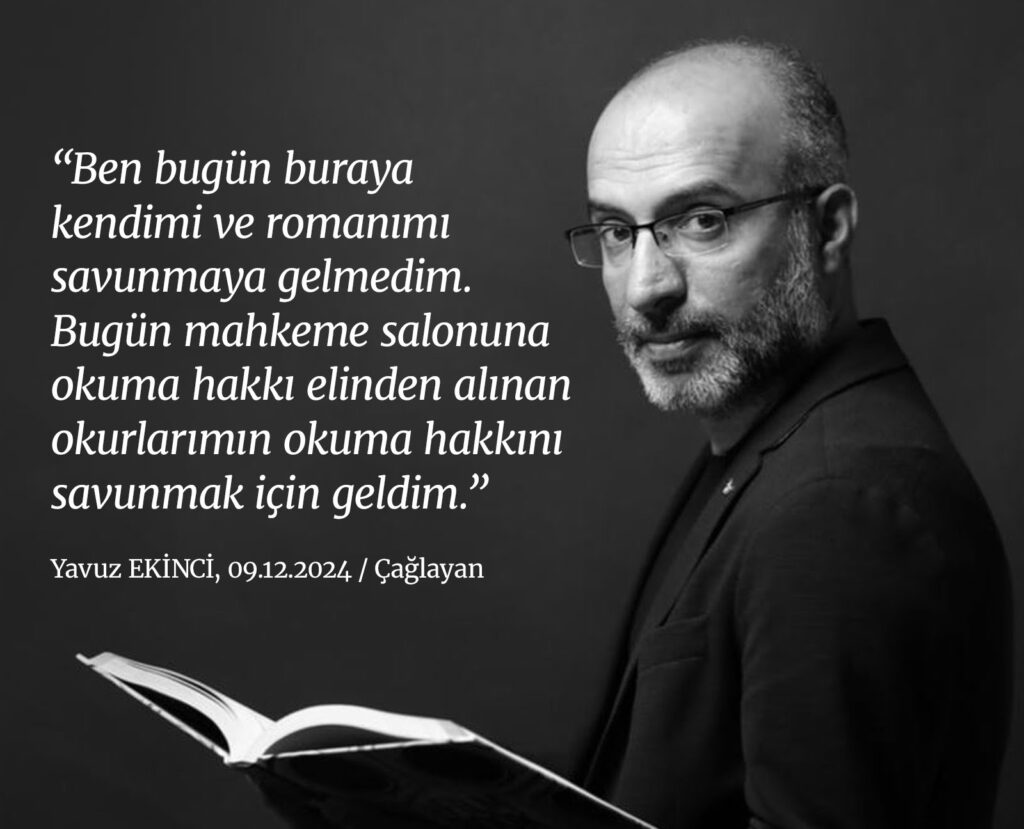 Savunmasında suçlamaları kabul etmediğini ifade eden Ekinci, “Yazdığım bir roman sebebiyle bu şekilde burada bulunmaktan ve suçlanmaktan dolayı bir yazar olarak hukuk devleti adına son derece üzüntü duyuyorum. Sayın Mahkemenin 2014 yılında yani 10 yıl önce yayımlanan Rüyası Bölünenler romanımı Anayasa ve AİHM’de de düzenlendiği üzere düşünce ve ifade özgürlüğü kapsamında değerlendirmesini ve beraatime karar verilmesini talep ediyorum,” dedi.