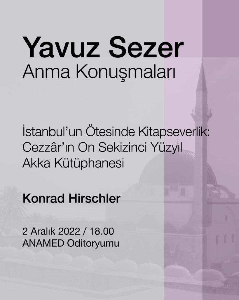 İstanbul Araştırmaları Enstitüsü, mimarlık tarihçisi Yavuz Sezer anısına, paydaş kurum ve kişilerle ortaklaşa düzenlediği konuşma serisinin ikincisinde, okumanın tarihi, kitap ve kütüphaneler konularında çalışmalar yürüten Konrad Hirschler’i konuk ediyor. “İstanbul’un Ötesinde Kitapseverlik: Cezzâr’ın On Sekizinci Yüzyıl Akka Kütüphanesi” başlıklı konuşma 2 Aralık Cuma günü saat 18.00’de ANAMED Oditoryumu’nda gerçekleşecek.