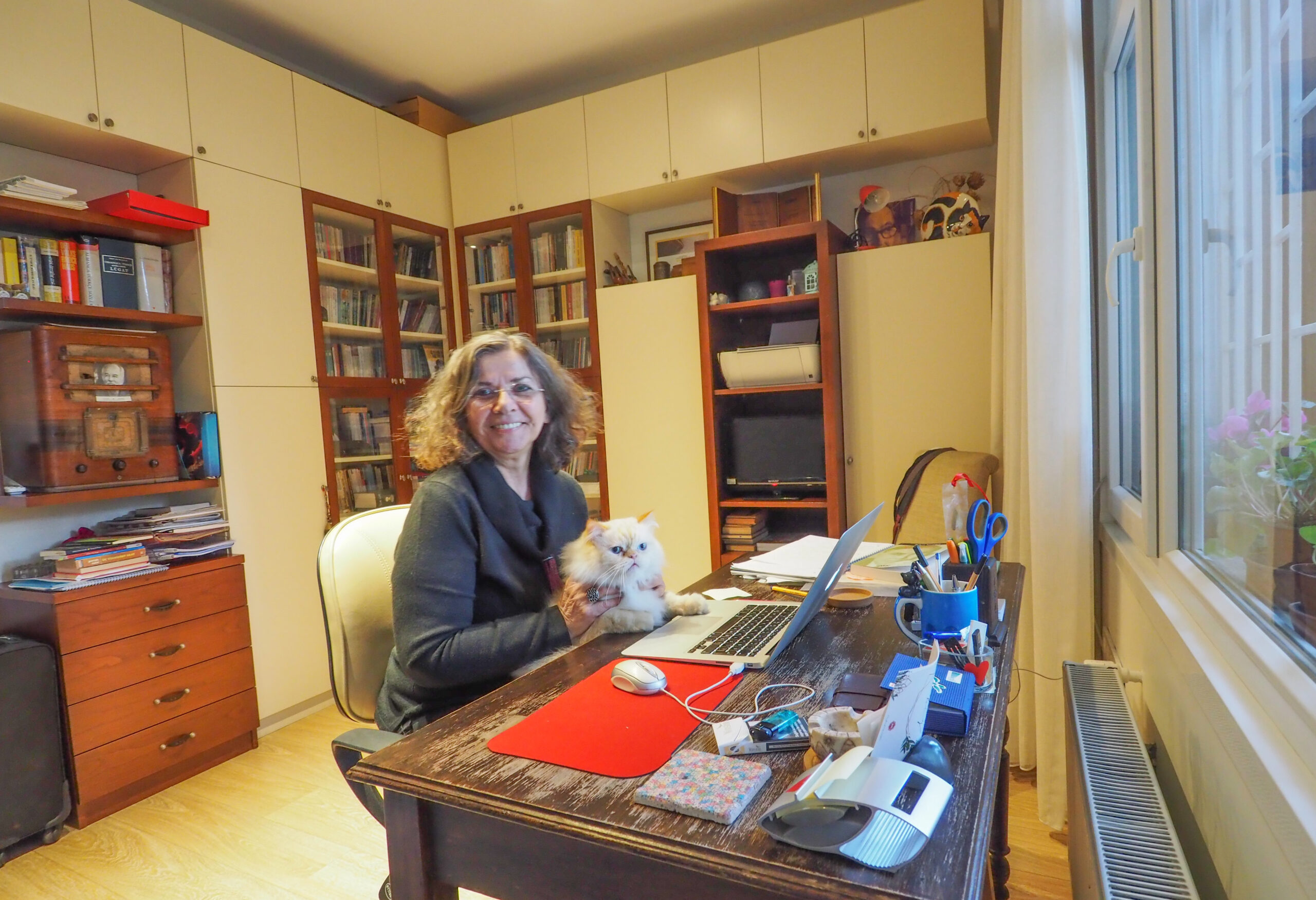Yaklaşık 10 yıldır ağırlıklı olarak Heybeliada’da yaşıyoruz, ama şehirde de kaldığımızdan Ayşe’nin her iki evde de çalışma odası ve kütüphanesi var. Yazılarını bu iki mekânda da bahçeye bakan bir masada, bilgisayarda yazıyor. Her yerde rahatlıkla çalışabiliyor, mutlaka çalışma odası ya da sessiz bir mekân aramıyor; vapurda, trende ya da bir cafede de yazabiliyor.