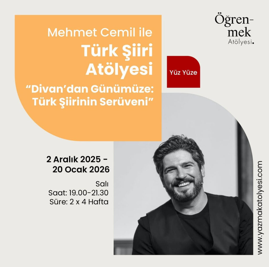 Yazmak Atölyesi’nin yeni programı Mehmet Cemil ile Türk Şiiri Atölyesi “Divan’dan Günümüze: Türk Şiirinin Serüveni”. “Divan’dan Günümüze: Türk Şiiri Atölyesi” dilin katmanlarını çözmek, sesini yeniden duymak isteyenler için tasarlandı. Sekiz haftalık programda, Yunus Emre’den Fuzuli’ye, Tevfik Fikret’ten Cemal Süreya’ya, Lale Müldür’den günümüz genç şairlerine kadar uzanan bir çizgide hem tarihsel dönüşüm hem de şiirin ruhsal derinliği birlikte okunacak. Her oturumda metin çözümlemeleri, yaratıcı yazma egzersizleri ve tartışmalarla katılımcı sadece bir dinleyici değil, şiirin içinde yol alan bir yorumcuya dönüşecek. Mehmet Cemil ile Türk Şiiri Atölyesi “Divan’dan Günümüze: Türk Şiirinin Serüveni” atölyesi şiire inanmak, kelimelerin nasıl bir ruh taşıdığını keşfetmek ve kendi sesini bulmak isteyen herkese açık.